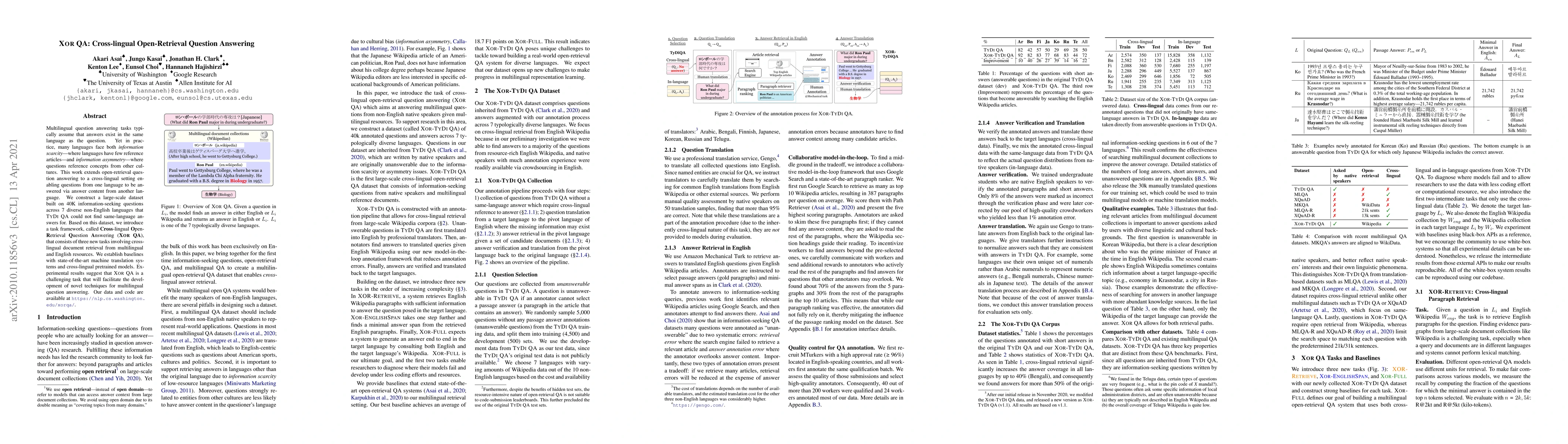 This paper proposes a cross-lingual open-retrieval question answering (XOR QA) framework to address information scarcity in multilingual settings, introducing a large dataset and baselines. The XOR QA task aims to answer questions in one language using resources from another language, showcasing its challenges and potential for developing new multilingual techniques.
