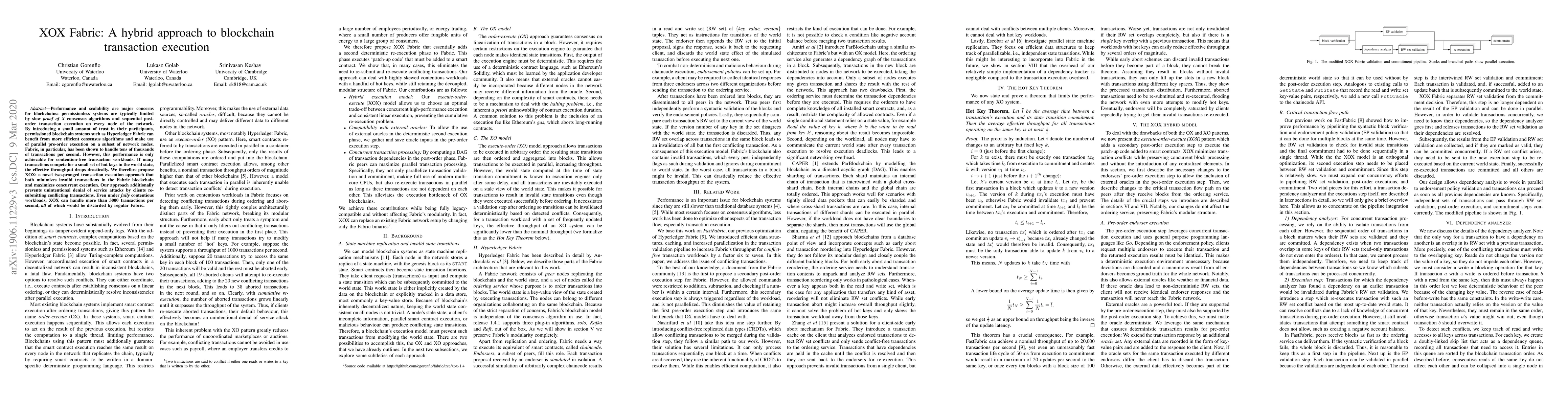The paper proposes XOX Fabric, a hybrid approach to enhance blockchain transaction execution by minimizing invalid transactions and maximizing concurrency, especially under contentious workloads. It achieves this by combining efficient consensus algorithms and parallel execution, maintaining throughput of over 3000 transactions per second even when competing transactions vie for the same resources.
