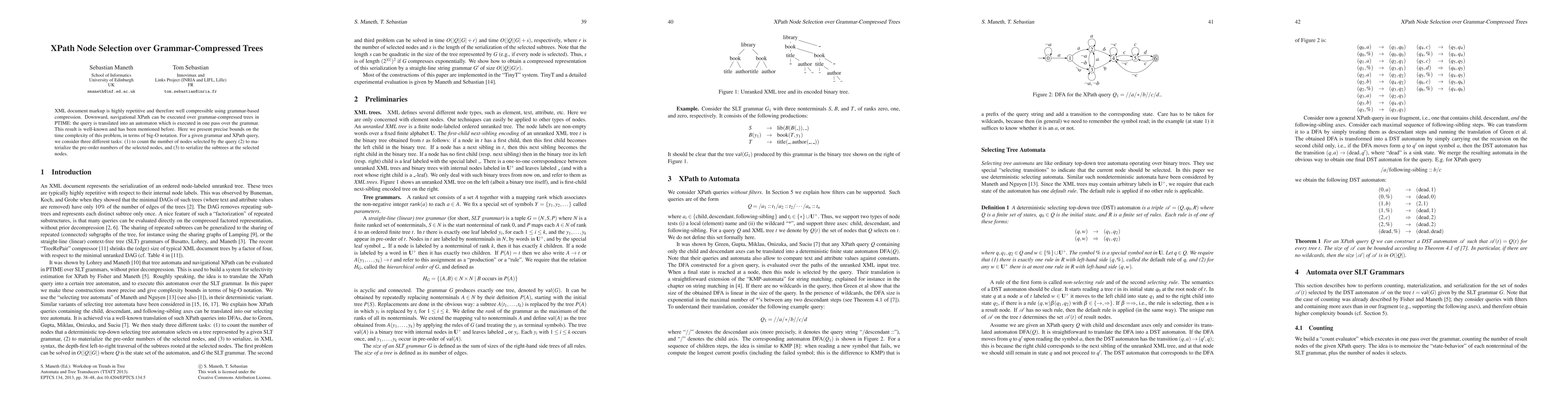 This paper investigates the time complexity of executing XPath queries over XML documents compressed using grammar-based compression, providing precise big-O notation bounds for counting selected nodes, materializing their pre-order numbers, and serializing subtrees at these nodes. The approach translates XPath queries into automata executed in a single pass over the compressed grammar.