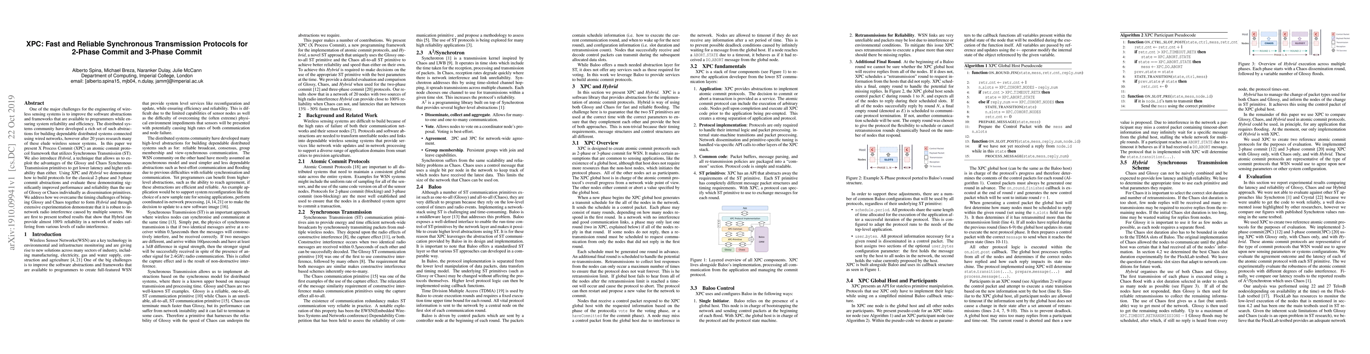 One of the major challenges for the engineering of wireless sensing systems is to improve the software abstractions and frameworks that are available to programmers while ensuring system reliability and efficiency. The distributed systems community have developed a rich set of such abstractions for building dependable distributed systems connected using wired networks, however after 20 years research many of these elude wireless sensor systems. In this paper we present X Process Commit (XPC) an atomic commit protocol framework that utilizes Synchronous Transmission (ST). We also introduce Hybrid, a technique that allows us to exploit the advantages of the Glossy and Chaos Synchronous Transmission primitives to get lower latency and higher reliability than either. Using XPC and Hybrid we demonstrate how to build protocols for the classical 2-phase and 3-phase commit abstractions and evaluate these demonstrating significantly improved performance and reliability than the use of Glossy or Chaos individually as dissemination primitives. We address how we overcame the timing challenges of bringing Glossy and Chaos together to form Hybrid and through extensive experimentation demonstrate that it is robust to in-network radio interference caused by multiple sources. We are first to present testbed results that show that Hybrid can provide almost 100% reliability in a network of nodes suffering from various levels of radio interference.