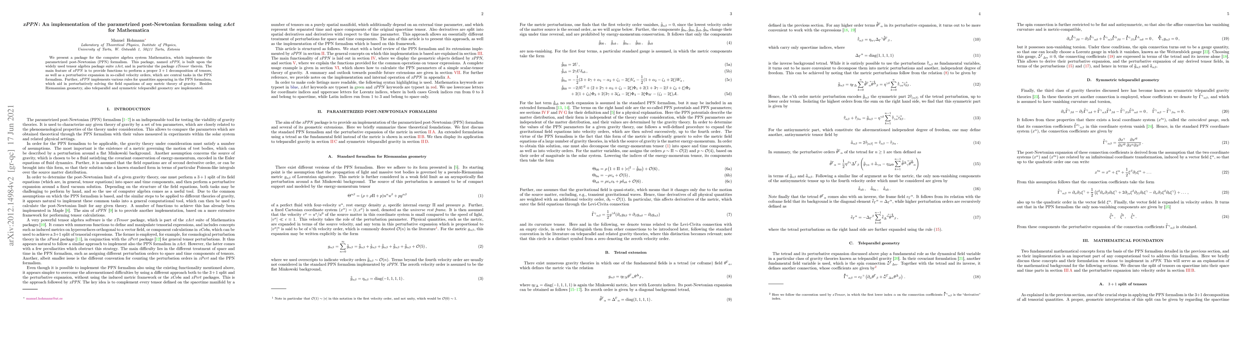 We present a package for the computer algebra system Mathematica, which implements the parametrized post-Newtonian (PPN) formalism. This package, named xPPN, is built upon the widely used tensor algebra package suite xAct, and in particular the package xTensor therein. The main feature of xPPN is to provide functions to perform a proper $3+1$ decomposition of tensors, as well as a perturbative expansion in so-called velocity orders, which are central tasks in the PPN formalism. Further, xPPN implements various rules for quantities appearing in the PPN formalism, which aid in perturbatively solving the field equations of any metric theory of gravity. Besides Riemannian geometry, also teleparallel and symmetric teleparallel geometry are implemented.