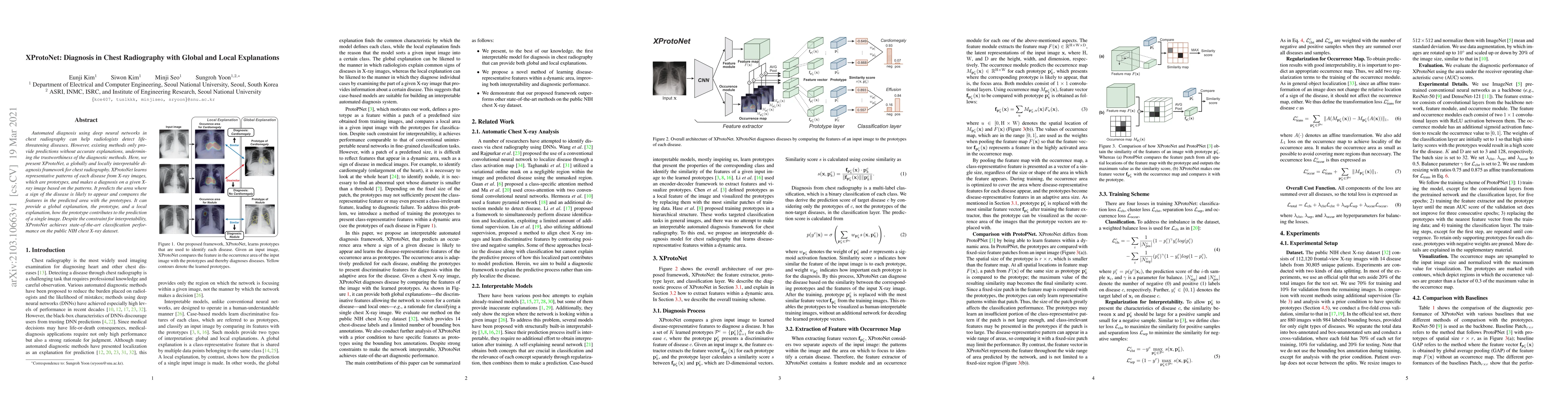Automated diagnosis using deep neural networks in chest radiography can help radiologists detect life-threatening diseases. However, existing methods only provide predictions without accurate explanations, undermining the trustworthiness of the diagnostic methods. Here, we present XProtoNet, a globally and locally interpretable diagnosis framework for chest radiography. XProtoNet learns representative patterns of each disease from X-ray images, which are prototypes, and makes a diagnosis on a given X-ray image based on the patterns. It predicts the area where a sign of the disease is likely to appear and compares the features in the predicted area with the prototypes. It can provide a global explanation, the prototype, and a local explanation, how the prototype contributes to the prediction of a single image. Despite the constraint for interpretability, XProtoNet achieves state-of-the-art classification performance on the public NIH chest X-ray dataset.