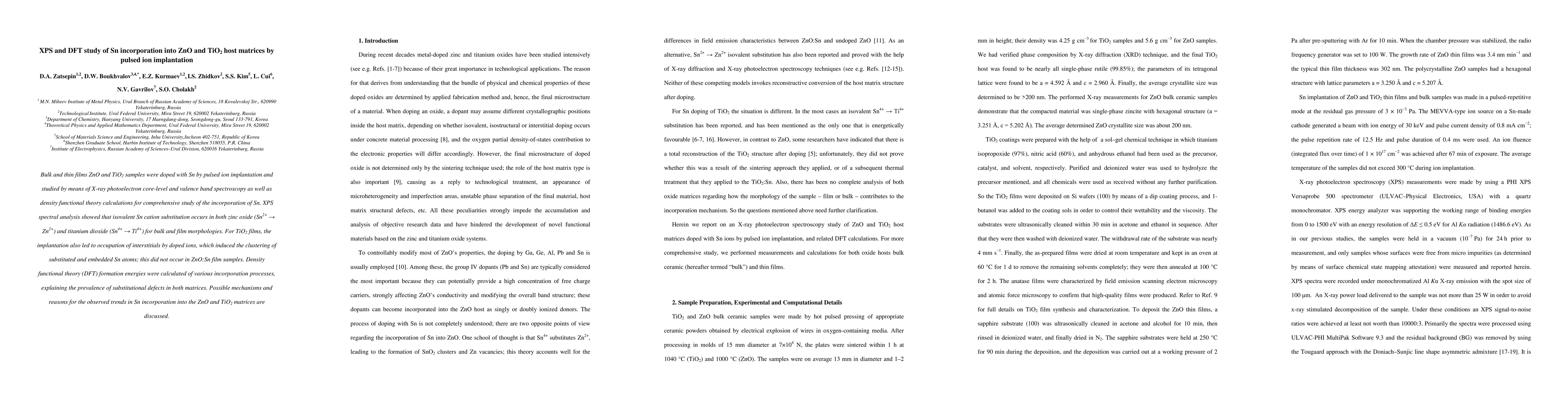 Bulk and thin films ZnO and TiO2 samples were doped with Sn by pulsed ion implantation and studied by means of X-ray photoelectron core-level and valence band spectroscopy as well as density functional theory calculations for comprehensive study of the incorporation of Sn. XPS spectral analysis showed that isovalent Sn cation substitution occurs in both zinc oxide (Sn2+ -> Zn2+) and titanium dioxide (Sn4+ -> Ti4+) for bulk and film morphologies. For TiO2 films, the implantation also led to occupation of interstitials by doped ions, which induced the clustering of substituted and embedded Sn atoms; this did not occur in ZnO:Sn film samples. Density functional theory (DFT) formation energies were calculated of various incorporation processes, explaining the prevalence of substitutional defects in both matrices. Possible mechanisms and reasons for the observed trends in Sn incorporation into the ZnO and TiO2 matrices are discussed.