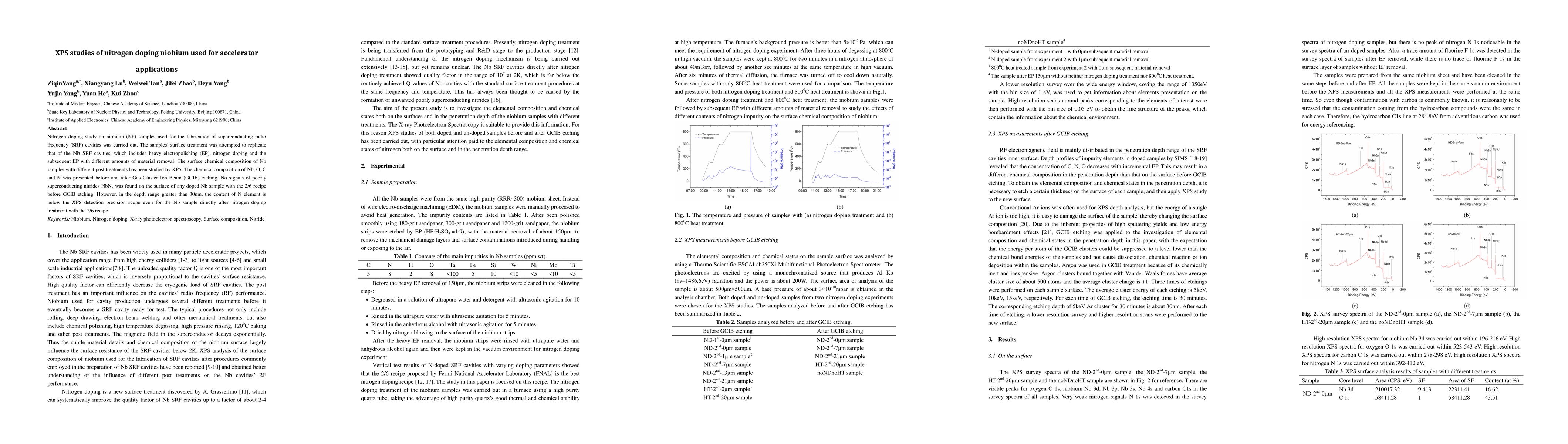 This study investigates nitrogen doping in niobium samples for superconducting radio frequency cavity applications, employing XPS to analyze surface chemical composition after various treatments. No poorly superconducting nitrides were detected on the surface, but nitrogen content was below XPS detection limits in depths greater than 30nm.