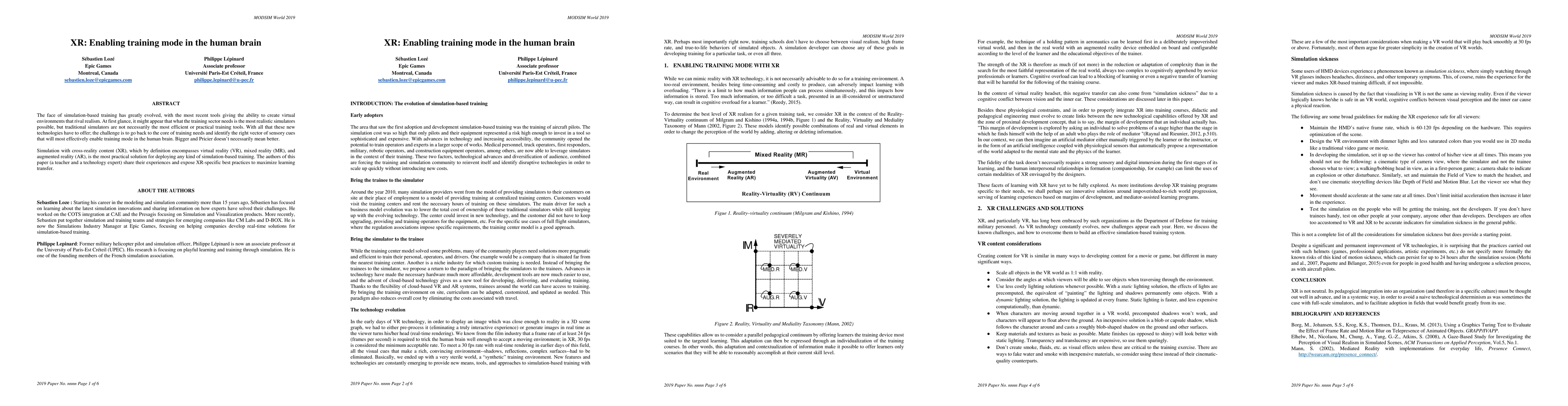 The face of simulation-based training has greatly evolved, with the most recent tools giving the ability to create virtual environments that rival realism. At first glance, it might appear that what the training sector needs is the most realistic simulators possible, but traditional simulators are not necessarily the most efficient or practical training tools. With all that these new technologies have to offer; the challenge is to go back to the core of training needs and identify the right vector of sensory cues that will most effectively enable training mode in the human brain. Bigger and Pricier doesn't necessarily mean better. Simulation with cross-reality content (XR), which by definition encompasses virtual reality (VR), mixed reality (MR), and augmented reality (AR), is the most practical solution for deploying any kind of simulation-based training. The authors of this paper (a teacher and a technology expert) share their experiences and expose XR-specific best practices to maximize learning transfer. ABOUT THE AUTHORS Sebastien Loze : Starting his career in the modeling and simulation community more than 15 years ago, S{\'e}bastien has focused on learning about the latest simulation innovations and sharing information on how experts have solved their challenges. He worked on the COTS integration at CAE and the Presagis focusing on Simulation and Visualization products. More recently, Sebastien put together simulation and training teams and strategies for emerging companies like CM Labs and D-BOX. He is now the Simulations Industry Manager at Epic Games, focusing on helping companies develop real-time solutions for simulation-based training. Philippe Lepinard: Former military helicopter pilot and simulation officer, Philippe L{\'e}pinard is now an associate professor at the University of Paris-Est Cr{\'e}teil (UPEC). His research is focusing on playful learning and training through simulation. He is one of the founding members of the French simulation association.