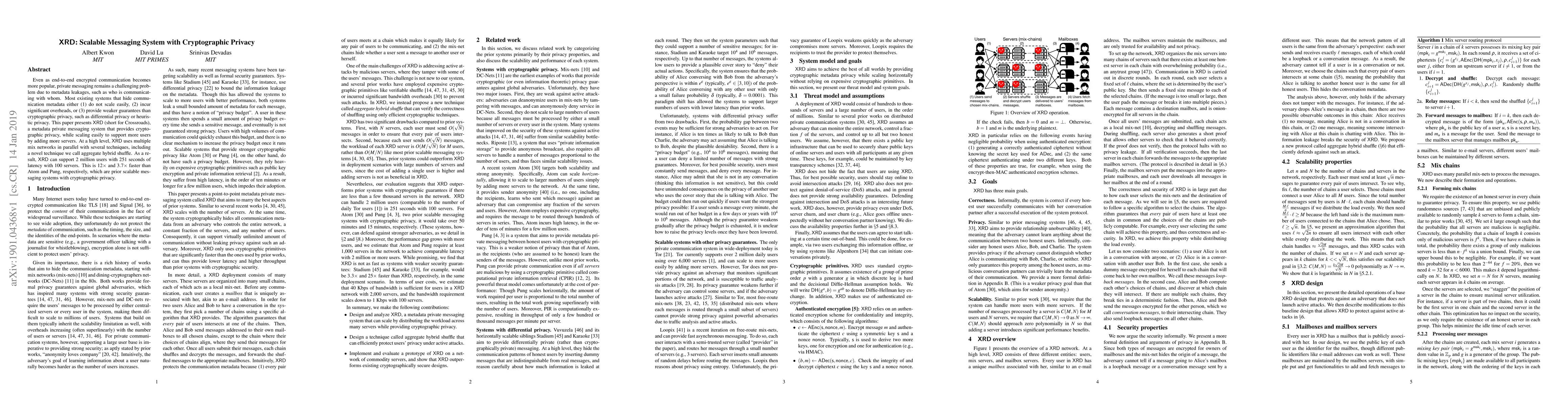 XRD is a scalable messaging system designed to provide cryptographic privacy and hide metadata, overcoming the limitations of existing solutions. It uses parallel mix networks and a novel aggregate hybrid shuffle technique to support 2 million users with significantly lower latency compared to prior systems.