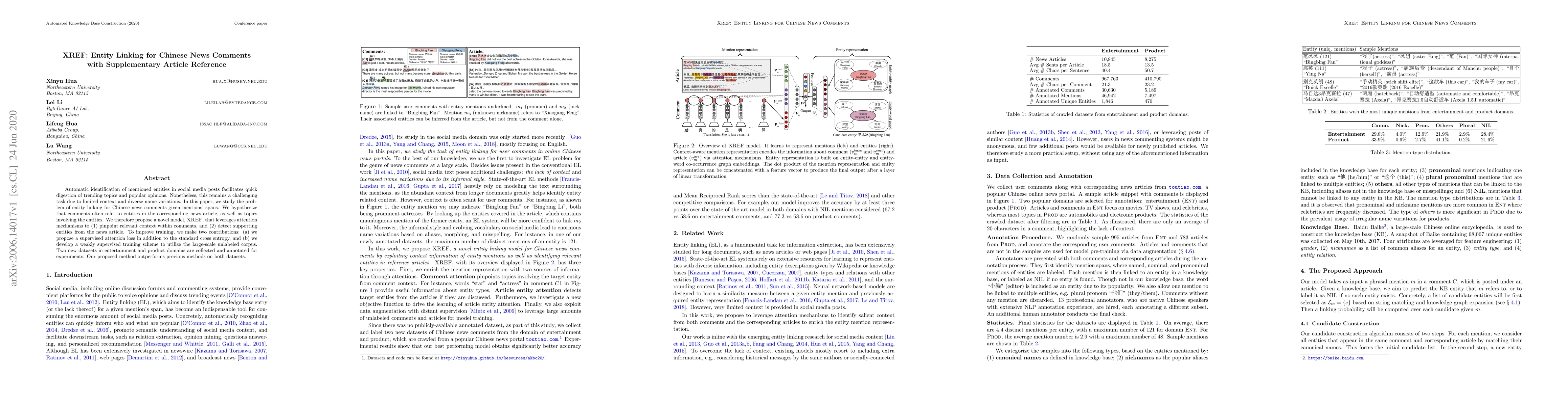 A new model called XREF is proposed to link entities in Chinese news comments with corresponding articles, improving accuracy through attention mechanisms and a weakly supervised training scheme. The model outperforms previous methods on two new datasets in entertainment and product domains.