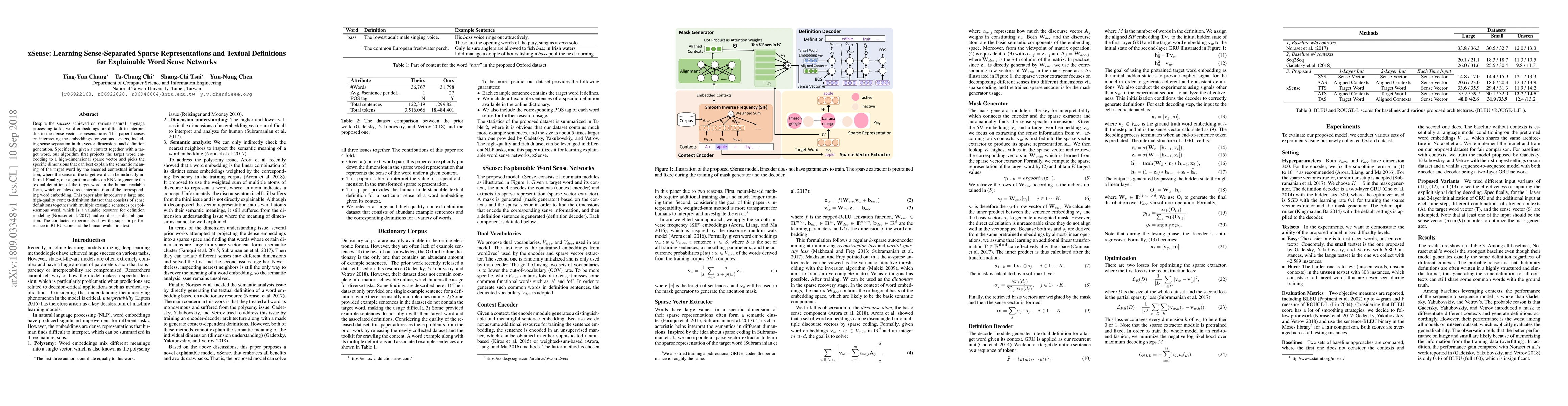 This paper proposes xSense, an algorithm that interprets word embeddings by projecting them into sparse representations and generating textual definitions, facilitating sense separation and direct interpretation. It also introduces a new dataset for context-definition modeling, demonstrating improved performance in definition generation and human evaluation.