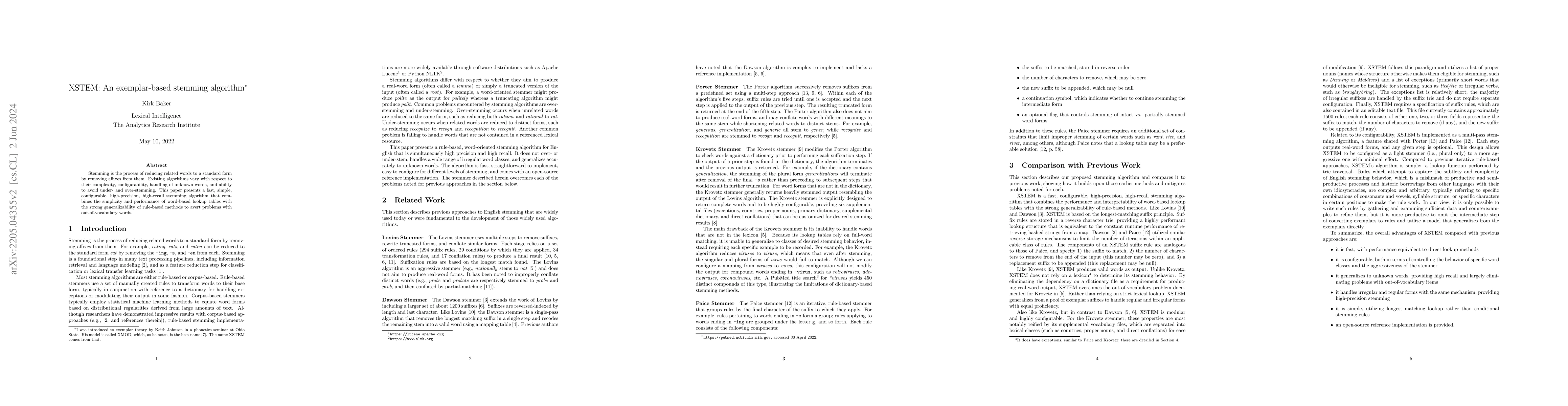 XSTEM is a simple, configurable stemming algorithm that achieves high precision and recall by blending word-based lookup tables with rule-based methods, effectively managing both known and unknown words while avoiding under- and over-stemming.