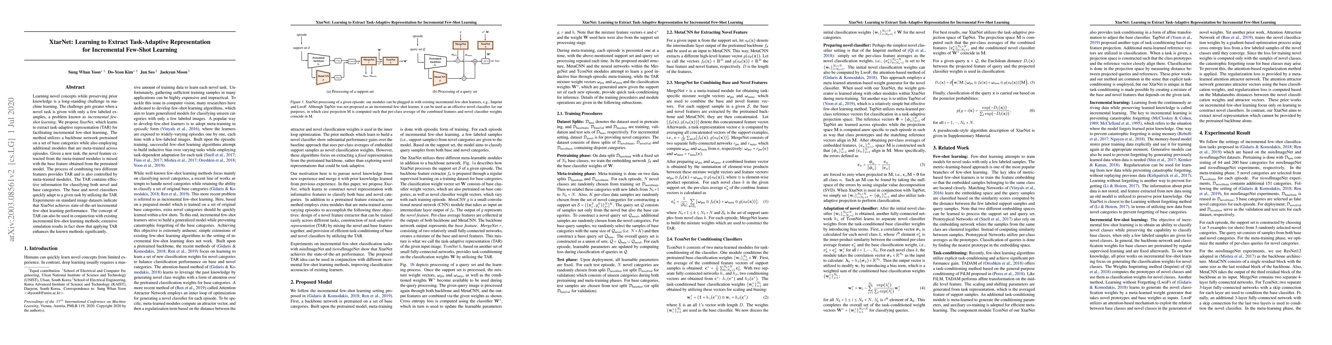 XtarNet proposes a method to extract task-adaptive representations (TAR) for incremental few-shot learning, combining pretrained base features with meta-trained modules to classify both novel and base categories efficiently. Experiments show that XtarNet achieves state-of-the-art performance and that TAR can enhance existing incremental few-shot learning methods.