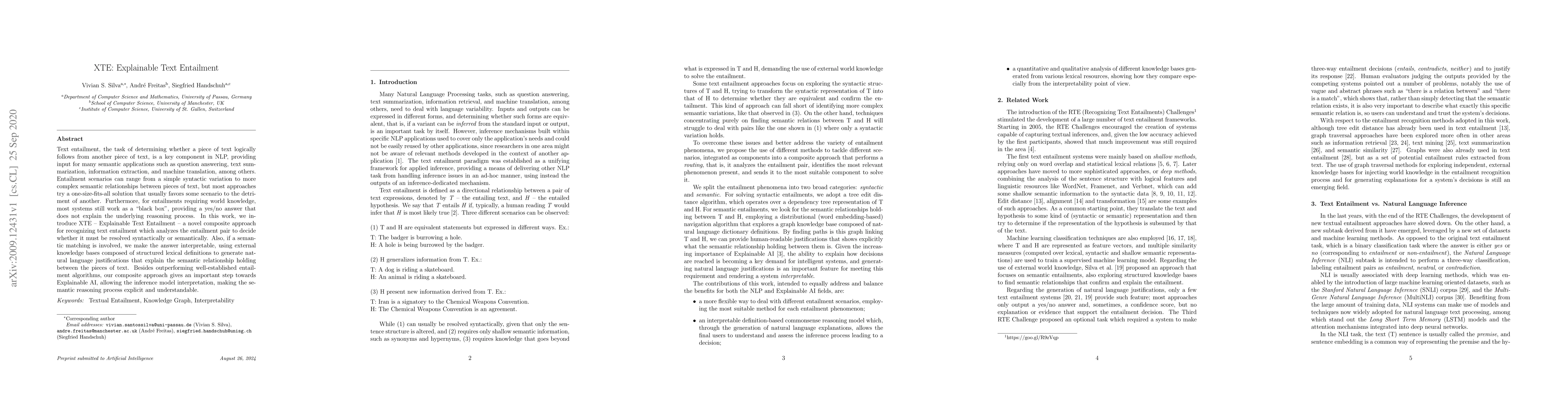 XTE - Explainable Text Entailment - introduces a composite approach for text entailment that determines whether a text logically follows from another, distinguishing between syntactic and semantic resolutions. It provides natural language explanations using external knowledge bases, enhancing interpretability and advancing the field of Explainable AI.