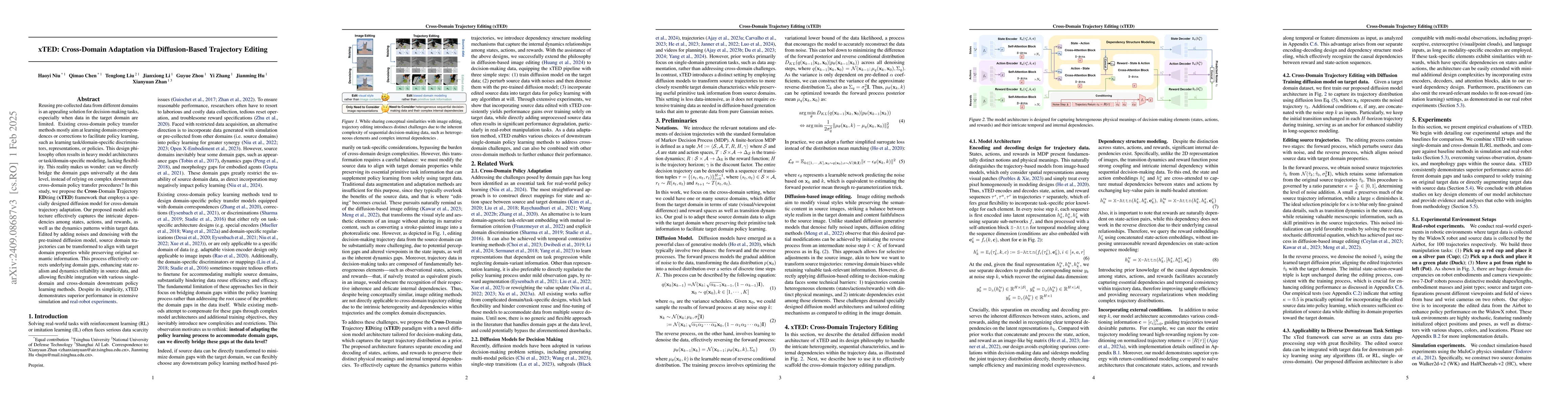 The paper proposes xTED, a framework for cross-domain policy adaptation using diffusion-based trajectory editing, featuring a Decision Diffusion Transformer (DDiT) to bridge domain gaps by transforming source trajectories to resemble target domain distributions. The method achieves superior performance over baselines in simulations and real-robot experiments.