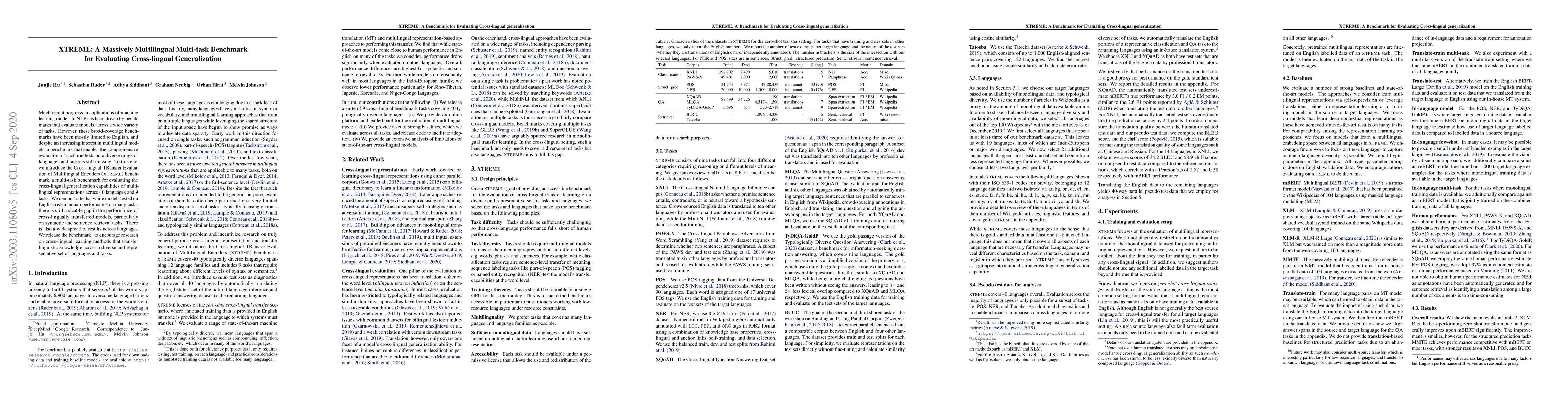 XTREME is a new multilingual multi-task benchmark designed to evaluate cross-lingual generalization across 40 languages and 9 tasks. It reveals significant performance gaps for cross-lingually transferred models, particularly in syntactic and sentence retrieval tasks, and highlights the need for further research on cross-lingual learning methods.