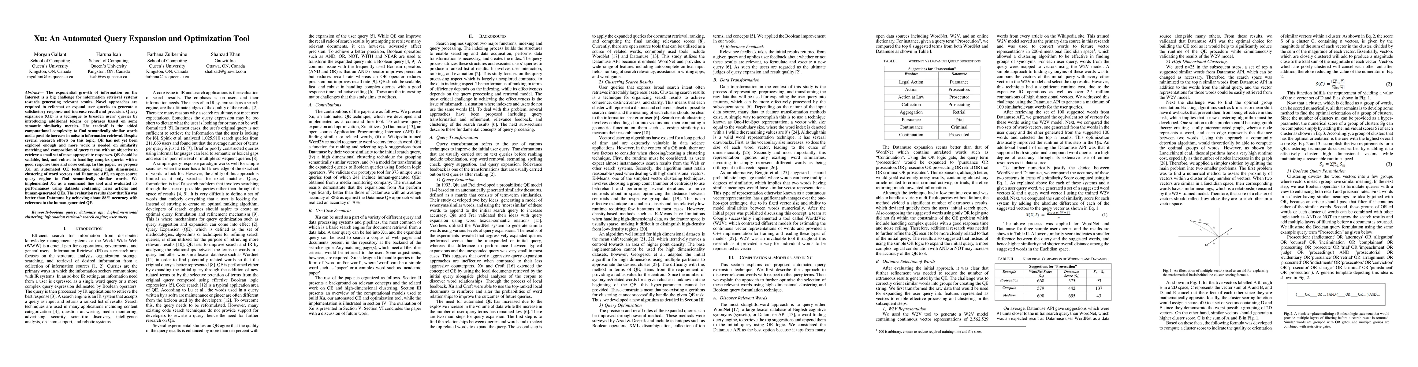 The exponential growth of information on the Internet is a big challenge for information retrieval systems towards generating relevant results. Novel approaches are required to reformat or expand user queries to generate a satisfactory response and increase recall and precision. Query expansion (QE) is a technique to broaden users' queries by introducing additional tokens or phrases based on some semantic similarity metrics. The tradeoff is the added computational complexity to find semantically similar words and a possible increase in noise in information retrieval. Despite several research efforts on this topic, QE has not yet been explored enough and more work is needed on similarity matching and composition of query terms with an objective to retrieve a small set of most appropriate responses. QE should be scalable, fast, and robust in handling complex queries with a good response time and noise ceiling. In this paper, we propose Xu, an automated QE technique, using high dimensional clustering of word vectors and Datamuse API, an open source query engine to find semantically similar words. We implemented Xu as a command line tool and evaluated its performances using datasets containing news articles and human-generated QEs. The evaluation results show that Xu was better than Datamuse by achieving about 88% accuracy with reference to the human-generated QE.