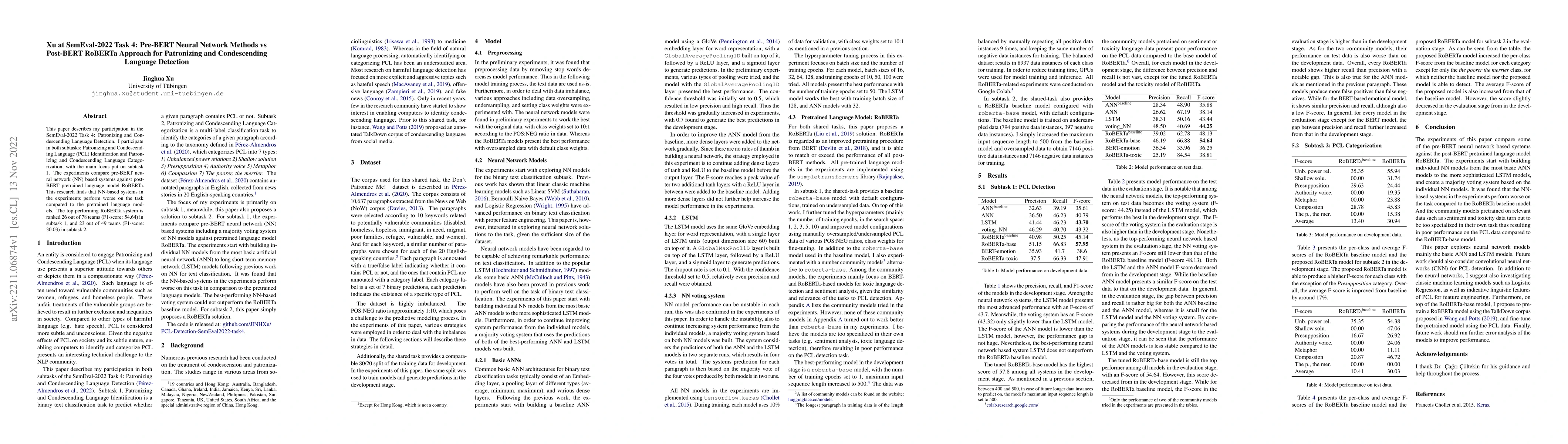 This paper describes my participation in the SemEval-2022 Task 4: Patronizing and Condescending Language Detection. I participate in both subtasks: Patronizing and Condescending Language (PCL) Identification and Patronizing and Condescending Language Categorization, with the main focus put on subtask 1. The experiments compare pre-BERT neural network (NN) based systems against post-BERT pretrained language model RoBERTa. This research finds NN-based systems in the experiments perform worse on the task compared to the pretrained language models. The top-performing RoBERTa system is ranked 26 out of 78 teams (F1-score: 54.64) in subtask 1, and 23 out of 49 teams (F1-score: 30.03) in subtask 2.