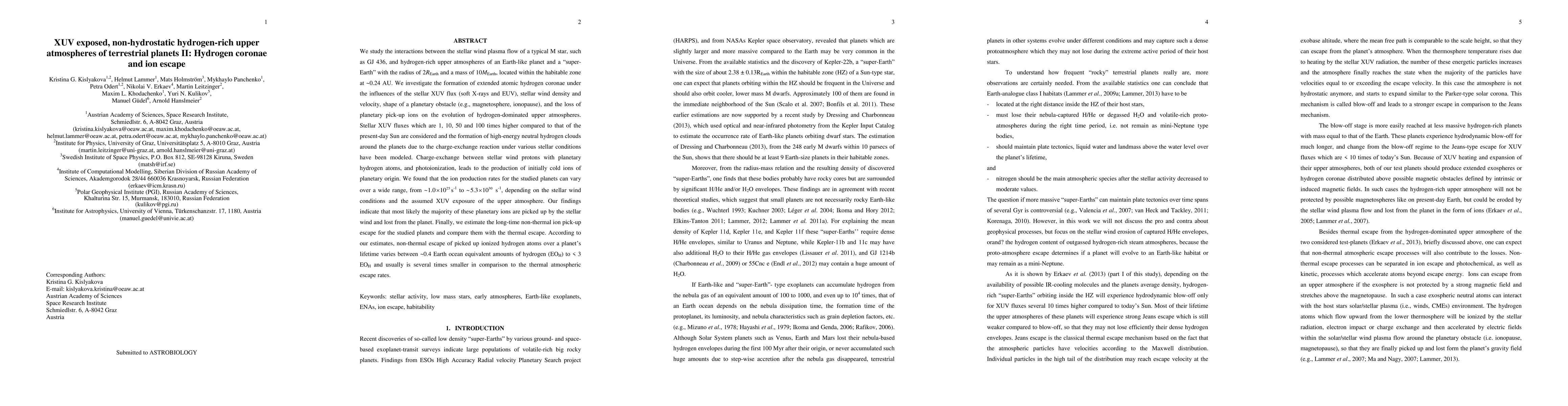 This paper investigates the interaction of stellar XUV flux and wind with the hydrogen-rich upper atmospheres of Earth-like and super-Earth planets, modeling the formation of hydrogen coronae and ion escape rates. The study finds that non-thermal ion escape is typically several times smaller than thermal escape, ranging from ~0.4 to <3 Earth ocean equivalent amounts of hydrogen over a planet's lifetime.