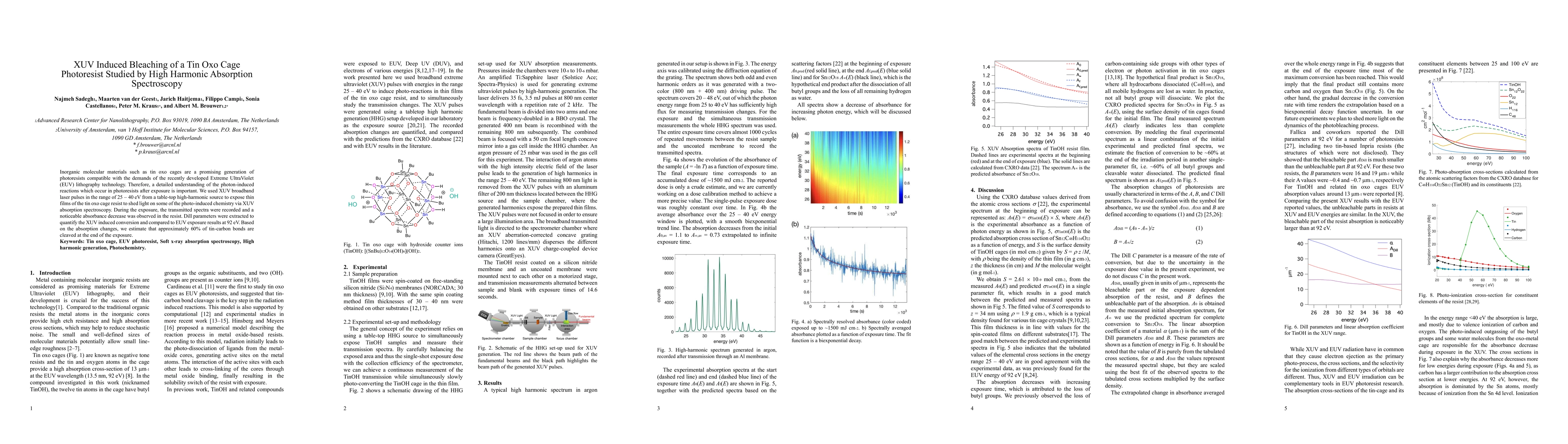 This study investigates the XUV-induced bleaching of a tin oxo cage photoresist using high harmonic absorption spectroscopy. Results show a significant absorbance decrease and 60% cleavage of tin-carbon bonds, highlighting the material's response to extreme ultraviolet exposure.