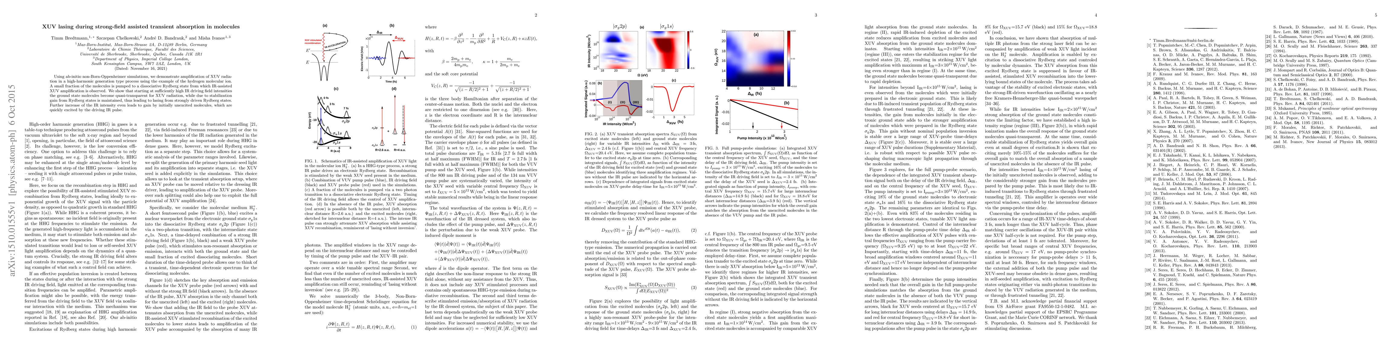 Researchers used ab-initio simulations to demonstrate XUV lasing in molecules pumped into a dissociative Rydberg state via strong-field assisted transient absorption. This process amplifies XUV radiation, leading to lasing from strongly driven Rydberg states.