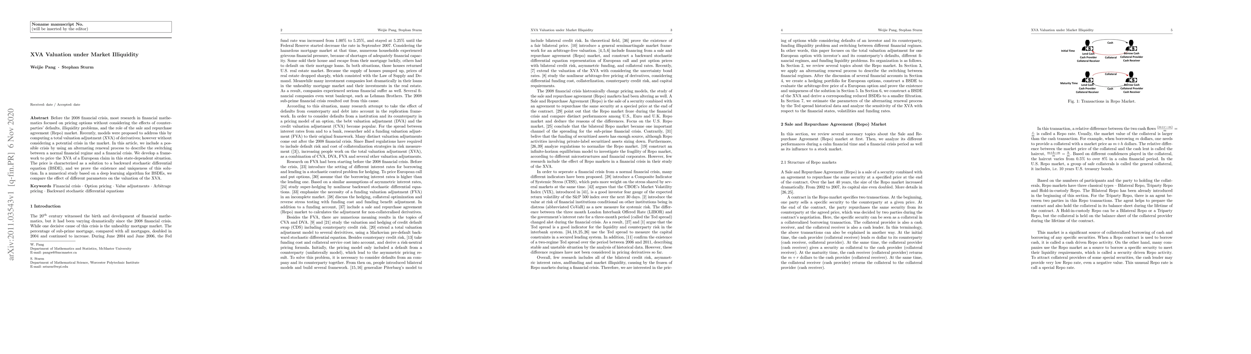 Before the 2008 financial crisis, most research in financial mathematics focused on pricing options without considering the effects of counterparties' defaults, illiquidity problems, and the role of the sale and repurchase agreement (Repo) market. Recently, models were proposed to address this by computing a total valuation adjustment (XVA) of derivatives; however without considering a potential crisis in the market. In this article, we include a possible crisis by using an alternating renewal process to describe the switching between a normal financial regime and a financial crisis. We develop a framework to price the XVA of a European claim in this state-dependent situation. The price is characterized as a solution to a backward stochastic differential equation (BSDE), and we prove the existence and uniqueness of this solution. In a numerical study based on a deep learning algorithm for BSDEs, we compare the effect of different parameters on the valuation of the XVA.