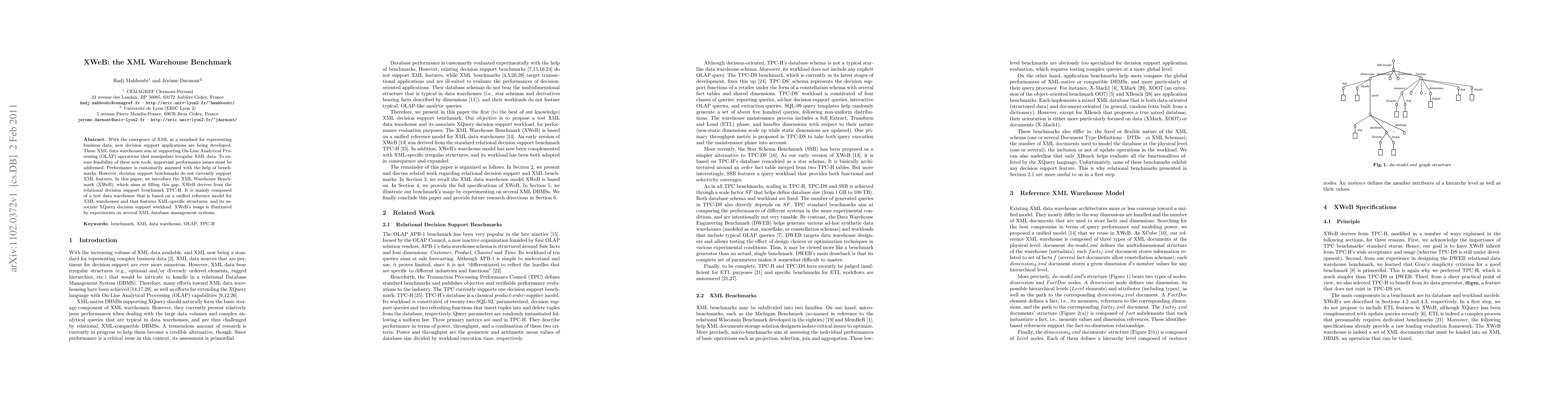 The paper introduces the XML Warehouse Benchmark (XWeB), designed to address performance issues in XML data warehouses supporting OLAP operations. XWeB, derived from the TPC-H benchmark, includes a test data warehouse with XML-specific structures and an associated XQuery workload, evaluated across various XML database management systems.