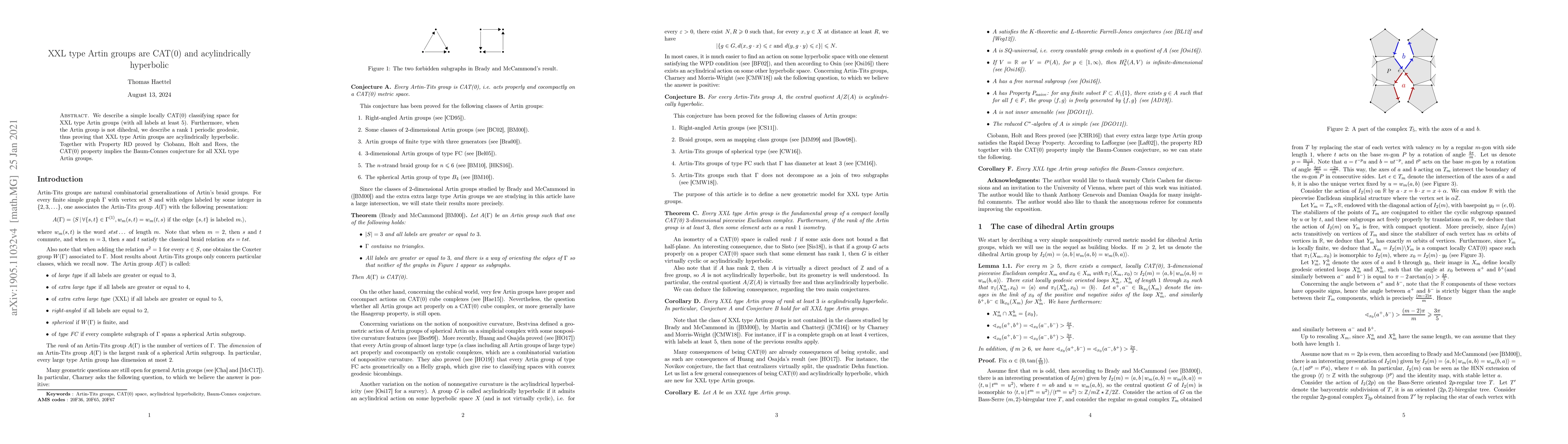 This paper presents a locally CAT(0) classifying space for XXL type Artin groups, demonstrating that they are acylindrically hyperbolic when not dihedral. It also confirms the Baum-Connes conjecture for these groups, supported by Property RD and their CAT(0) nature.