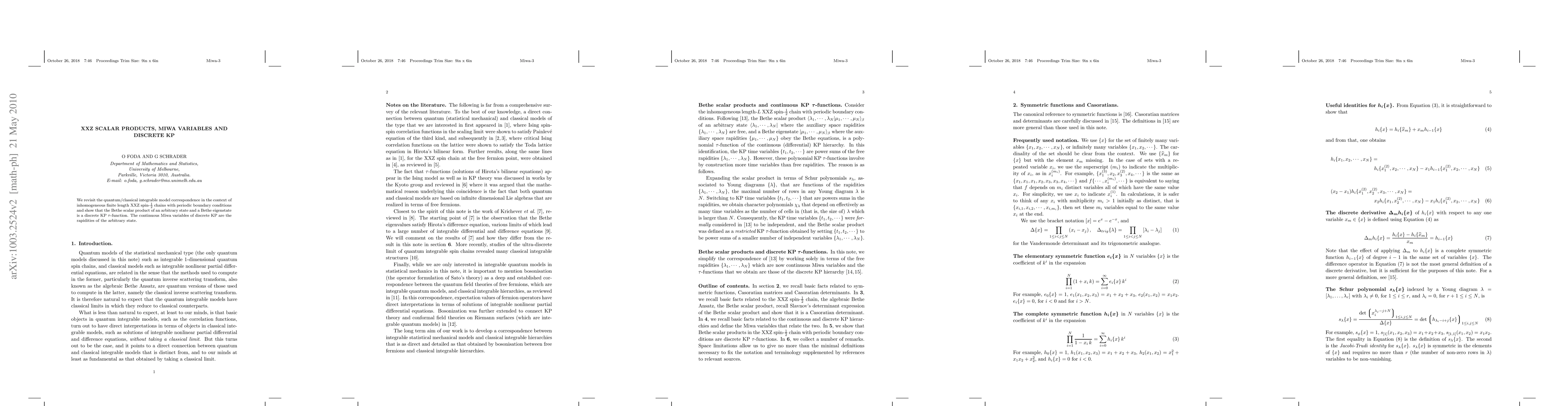 The paper revisits the quantum/classical integrable model correspondence for inhomogeneous finite length XXZ spin-1/2 chains with periodic boundary conditions, demonstrating that the Bethe scalar product of an arbitrary state and a Bethe eigenstate corresponds to a discrete KP tau-function.