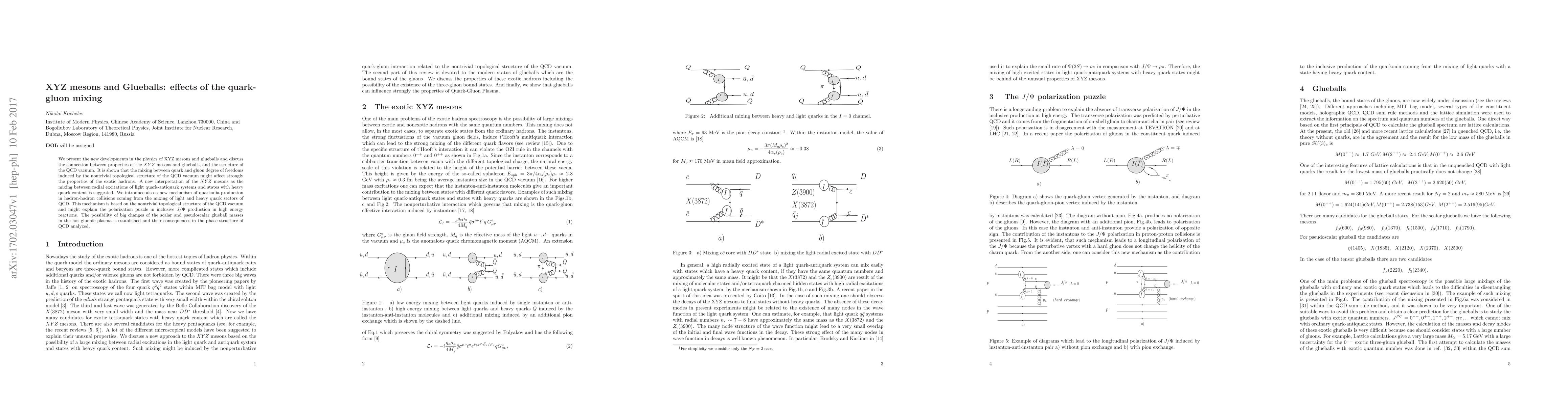 This paper explores the impact of quark-gluon mixing on XYZ mesons and glueballs, suggesting a new interpretation of XYZ mesons as a blend of light quark-antiquark excitations and heavy quark states. It also proposes a novel mechanism for quarkonia production in high-energy collisions, potentially resolving the polarization puzzle in J/Ψ production.
