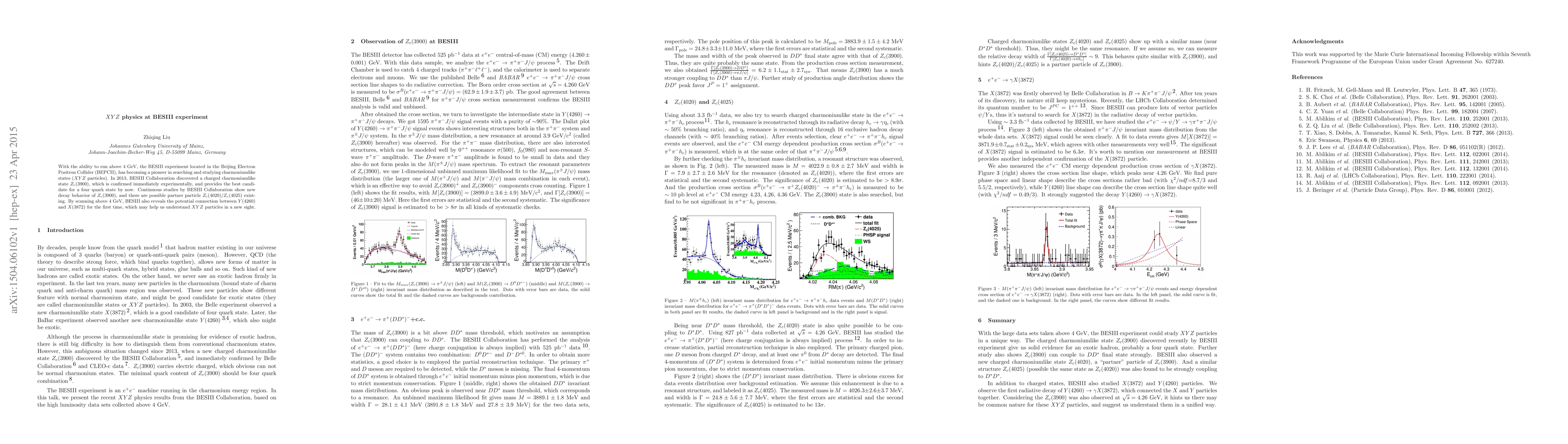 The BESIII experiment at the Beijing Electron Positron Collider (BESIII) has discovered and studied charmoniumlike states, notably the $Z_c(3900)$ particle, which is a leading candidate for a four-quark state. Further investigations suggest the existence of potential partner particles and a possible connection between $Y(4260)$ and $X(3872)$.
