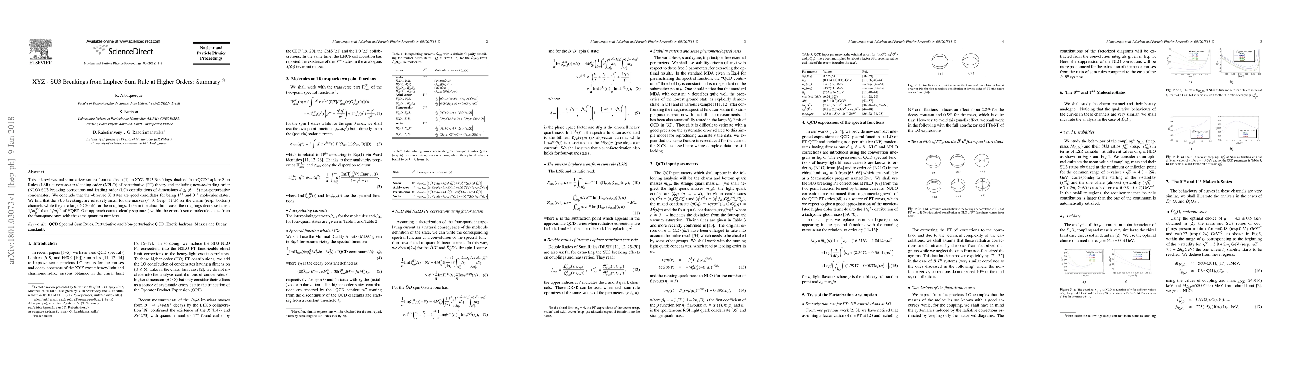Researchers analyzed XYZ-SU3 breakings using Laplace Sum Rule at higher orders, finding small SU3 breakings for masses but large ones for couplings, suggesting 1^++ and 0^++ molecule states.