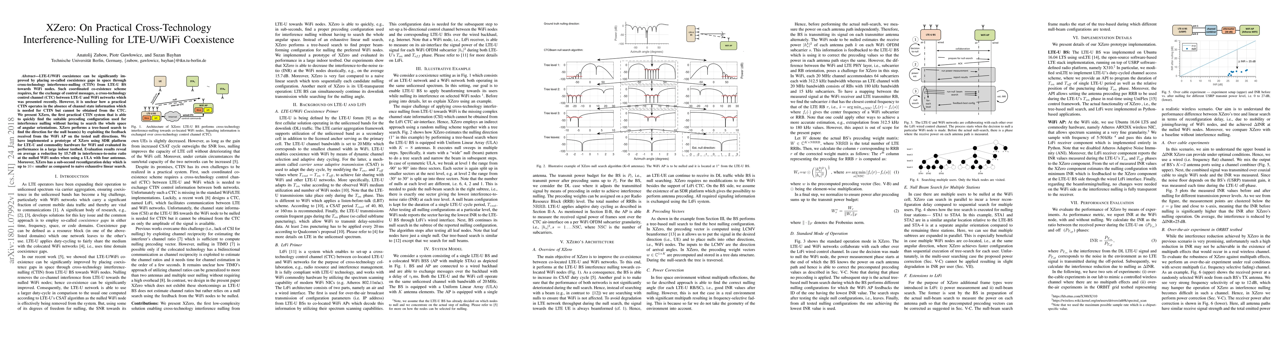 XZero presents a practical cross-technology interference-nulling (CTIN) system for LTE-U/WiFi coexistence, achieving significant interference reduction without requiring exhaustive channel state information. It employs a tree-based search method to quickly determine optimal null beam configurations, demonstrating a 15.7 dB reduction in interference-to-noise ratio with a reconfiguration delay up to 10x faster than traditional methods.