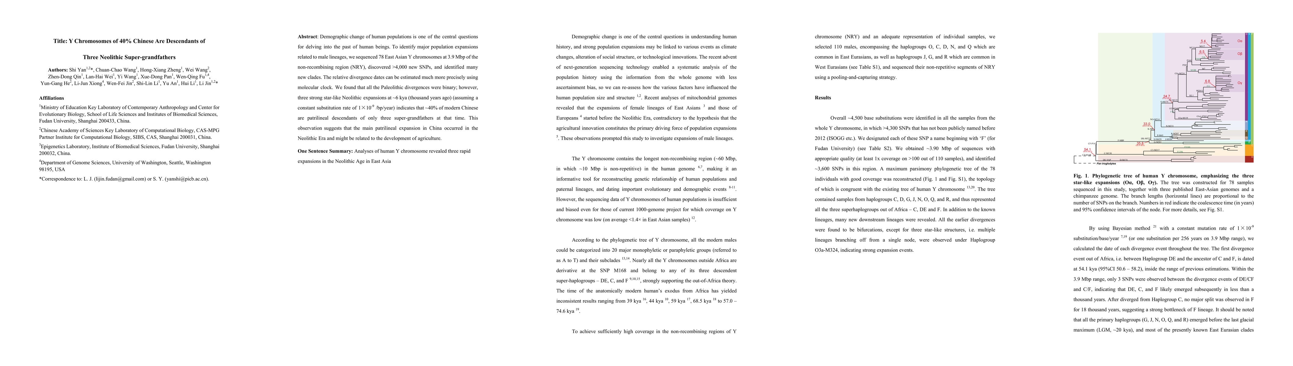 This study sequenced 78 East Asian Y chromosomes to identify major male lineage expansions, revealing that ~40% of modern Chinese men are descendants of three Neolithic super-grandfathers from a significant population expansion around 6,000 years ago. This suggests a major patrilineal demographic shift in China linked to the advent of agriculture.
