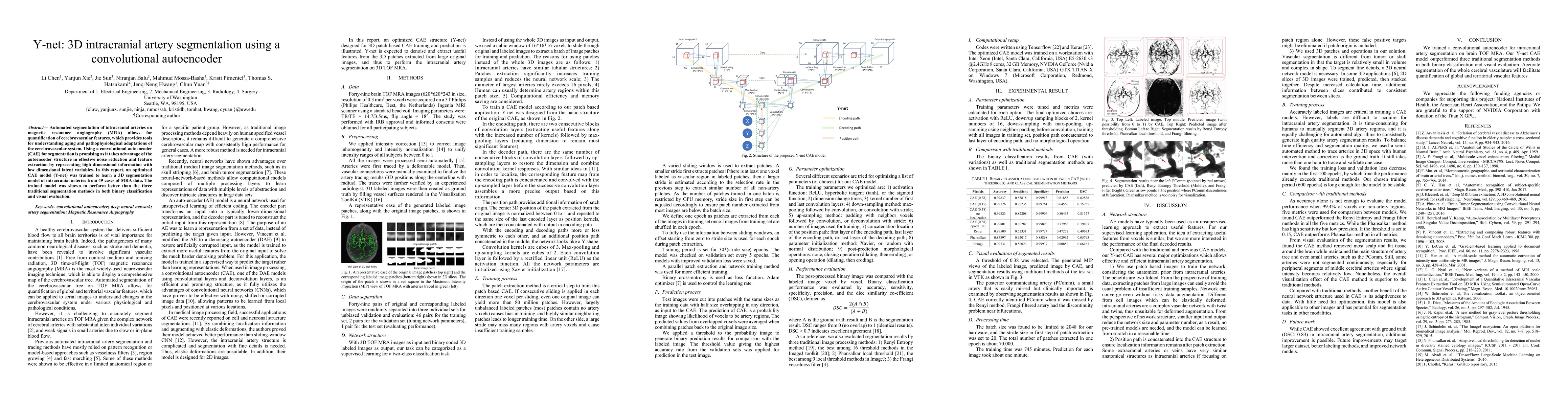 Automated segmentation of intracranial arteries on magnetic resonance angiography (MRA) allows for quantification of cerebrovascular features, which provides tools for understanding aging and pathophysiological adaptations of the cerebrovascular system. Using a convolutional autoencoder (CAE) for segmentation is promising as it takes advantage of the autoencoder structure in effective noise reduction and feature extraction by representing high dimensional information with low dimensional latent variables. In this report, an optimized CAE model (Y-net) was trained to learn a 3D segmentation model of intracranial arteries from 49 cases of MRA data. The trained model was shown to perform better than the three traditional segmentation methods in both binary classification and visual evaluation.