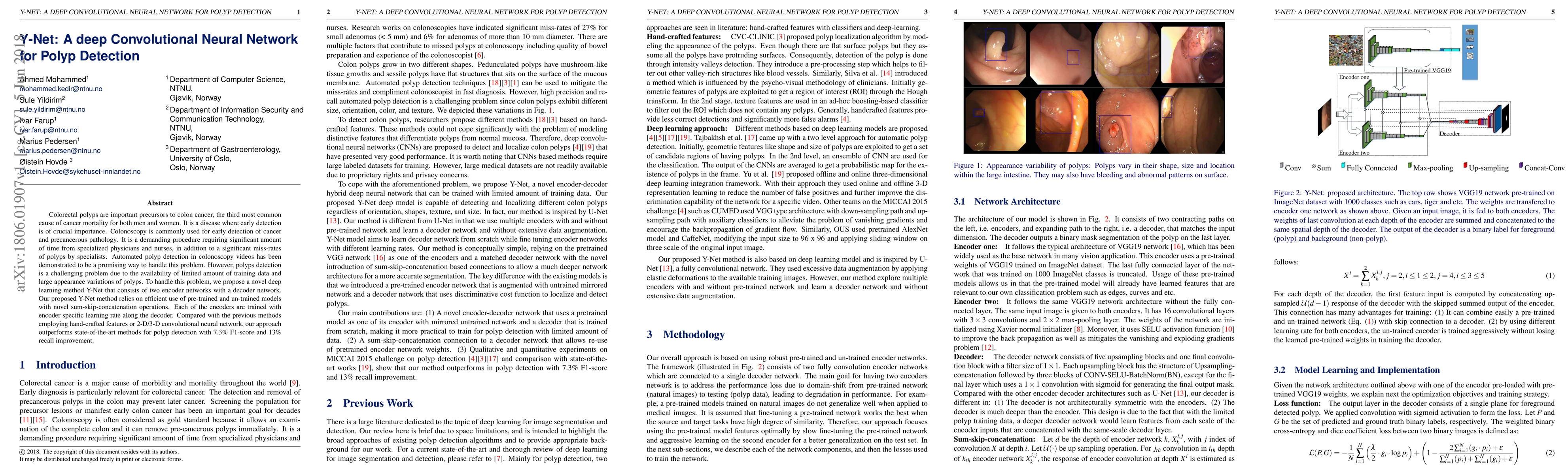 The paper proposes Y-Net, a deep convolutional neural network for polyp detection in colonoscopy videos. It consists of two encoder networks with a decoder network, utilizing pre-trained and un-trained models with sum-skip-concatenation operations. Each encoder is trained with encoder-specific learning rates alongside the decoder.