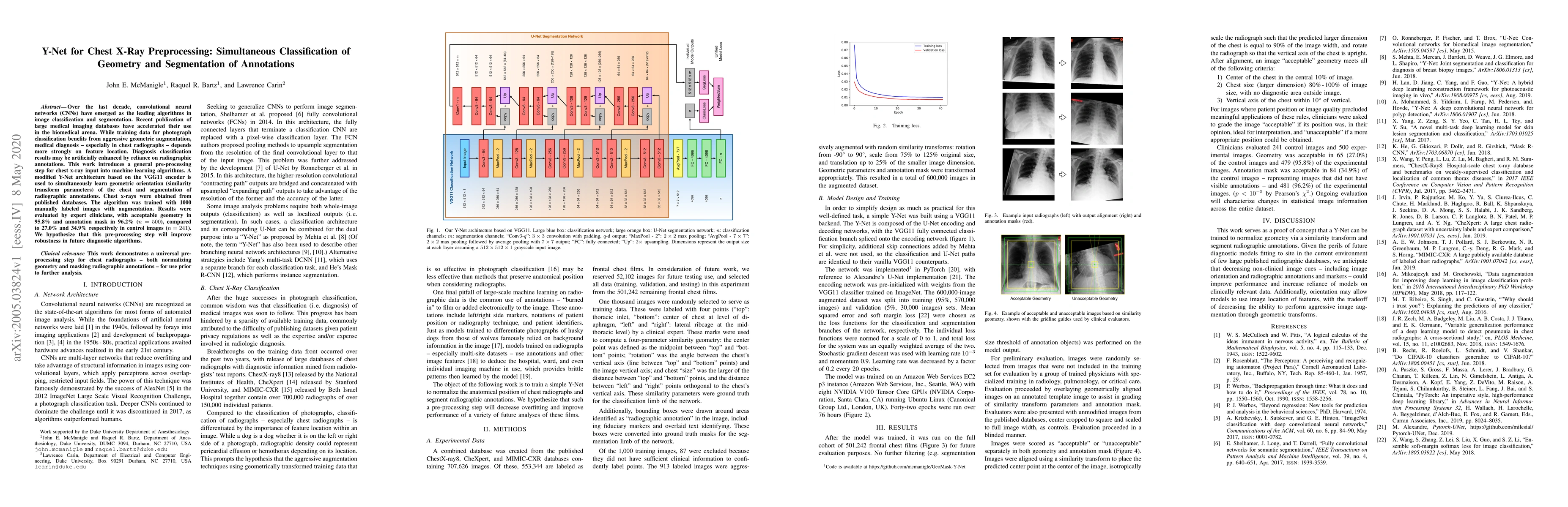 Over the last decade, convolutional neural networks (CNNs) have emerged as the leading algorithms in image classification and segmentation. Recent publication of large medical imaging databases have accelerated their use in the biomedical arena. While training data for photograph classification benefits from aggressive geometric augmentation, medical diagnosis -- especially in chest radiographs -- depends more strongly on feature location. Diagnosis classification results may be artificially enhanced by reliance on radiographic annotations. This work introduces a general pre-processing step for chest x-ray input into machine learning algorithms. A modified Y-Net architecture based on the VGG11 encoder is used to simultaneously learn geometric orientation (similarity transform parameters) of the chest and segmentation of radiographic annotations. Chest x-rays were obtained from published databases. The algorithm was trained with 1000 manually labeled images with augmentation. Results were evaluated by expert clinicians, with acceptable geometry in 95.8% and annotation mask in 96.2% (n=500), compared to 27.0% and 34.9% respectively in control images (n=241). We hypothesize that this pre-processing step will improve robustness in future diagnostic algorithms.