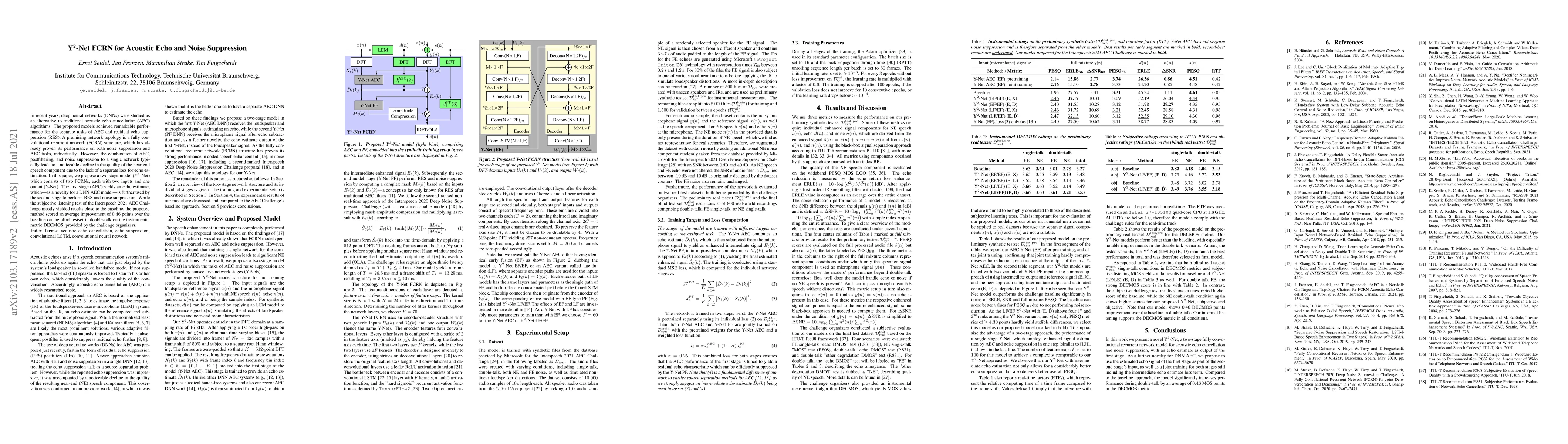 In recent years, deep neural networks (DNNs) were studied as an alternative to traditional acoustic echo cancellation (AEC) algorithms. The proposed models achieved remarkable performance for the separate tasks of AEC and residual echo suppression (RES). A promising network topology is a fully convolutional recurrent network (FCRN) structure, which has already proven its performance on both noise suppression and AEC tasks, individually. However, the combination of AEC, postfiltering, and noise suppression to a single network typically leads to a noticeable decline in the quality of the near-end speech component due to the lack of a separate loss for echo estimation. In this paper, we propose a two-stage model (Y$^2$-Net) which consists of two FCRNs, each with two inputs and one output (Y-Net). The first stage (AEC) yields an echo estimate, which - as a novelty for a DNN AEC model - is further used by the second stage to perform RES and noise suppression. While the subjective listening test of the Interspeech 2021 AEC Challenge mostly yielded results close to the baseline, the proposed method scored an average improvement of 0.46 points over the baseline on the blind testset in double-talk on the instrumental metric DECMOS, provided by the challenge organizers.
