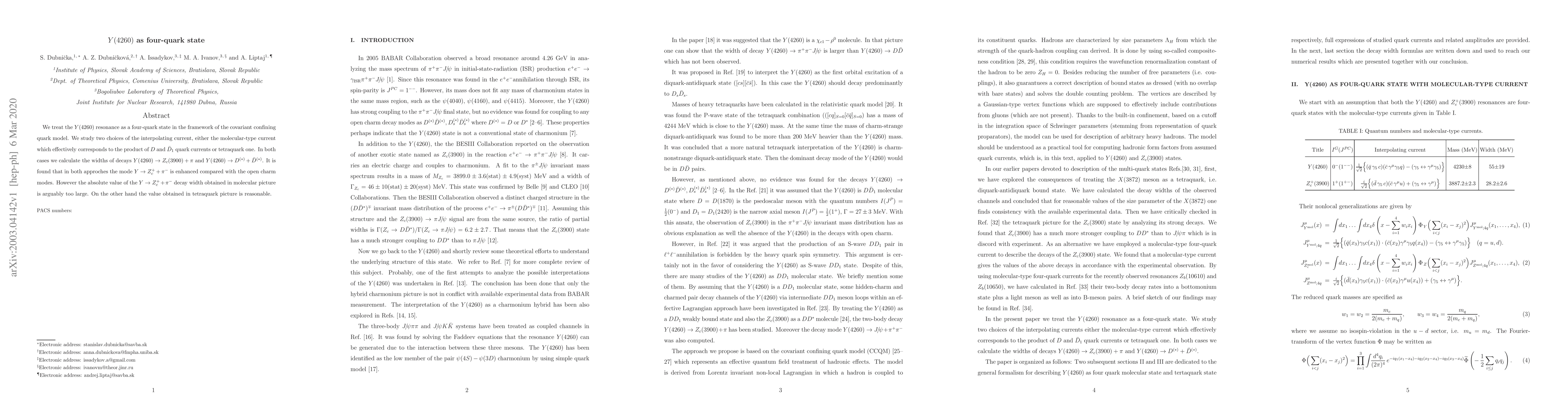 This paper explores the $Y(4260)$ resonance as a four-quark state using the covariant confining quark model, comparing molecular and tetraquark interpretations. It finds that the tetraquark model provides a more reasonable decay width for $Y(4260)\to Z_c(3900)+\pi$ compared to the molecular model.