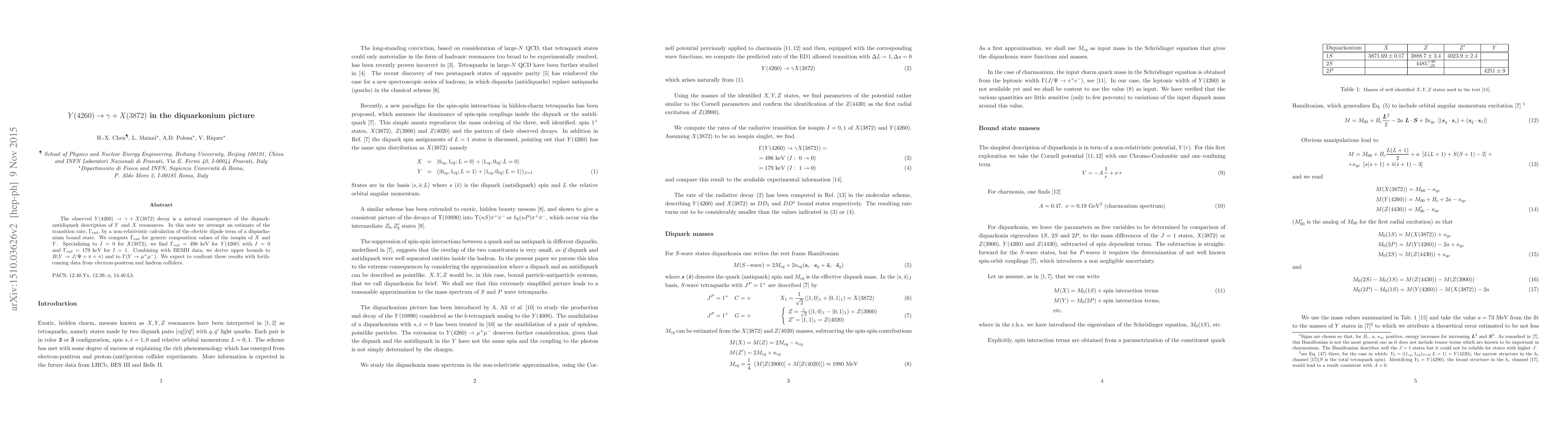 The observed Y(4260)\to \gamma + X(3872) decay is a natural consequence of the diquark-antidiquark description of Y and X resonances. In this note we attempt an estimate of the transition rate, \Gamma_{\rm rad}, by a non-relativistic calculation of the electric dipole term of a diquarkonium bound state. We compute \Gamma_{\rm rad} for generic composition values of the isospin of X and Y. Specializing to I=0 for X(3872), we find \Gamma_{\rm rad}= 496~keV for Y(4260) with I=0 and \Gamma_{\rm rad}= 179~keV for I=1. Combining with BESIII data, we derive upper bounds to B(Y\to J/\Psi+\pi+\pi) and to \Gamma(Y\to \mu^+ \mu^-). We expect to confront these results with forthcoming data from electron-positron and hadron colliders.