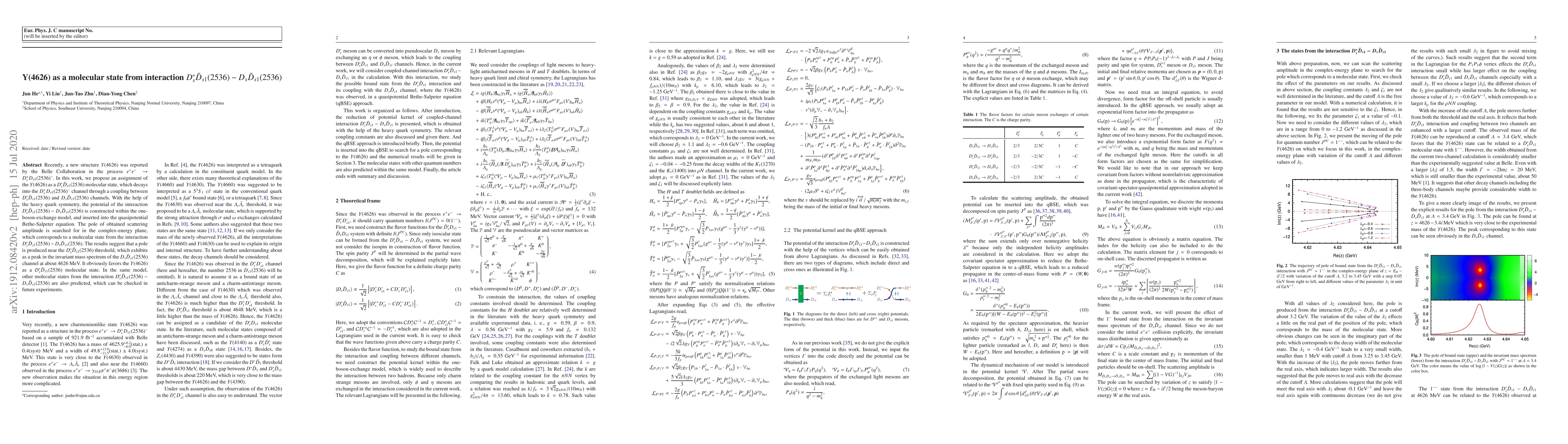 Recently, a new structure $Y(4626)$ was reported by the Belle Colloboration in the process $e^+e^-\to D_s^+D_{s1}(2536)^-$. In this work, we propose an assignment of the $Y(4626)$ as a ${D}^*_s\bar{D}_{s1}(2536)$ molecular state, which decays into the $D_s^+D_{s1}(2536)^-$ channel through a coupling between ${D}^*_s\bar{D}_{s1}(2536)$ and ${D}_s\bar{D}_{s1}(2536)$ channels. With the help of the heavy quark symmetry, the potential of the interaction ${D}^*_s\bar{D}_{s1}(2536)-{D}_s\bar{D}_{s1}(2536)$ is constructed within the one-boson-exchange model, and inserted into the quasipotential Bethe-Salpeter equation. The pole of obtained scattering amplitude is searched for in the complex plane, which corresponds to a molecular state from the interaction ${D}^*_s\bar{D}_{s1}(2536)-{D}_s\bar{D}_{s1}(2536)$. The results suggest that a pole is produced near the ${D}^*_s\bar{D}_{s1}(2536)$ threshold, which exhibits as a peak in the invariant mass spectrum of the ${D}_s\bar{D}_{s1}(2536)$ channel at about 4626 MeV. It obviously favors the $Y(4265)$ as a ${D}^*_s\bar{D}_{s1}(2536)$ molecular state. In the same model, other molecular states from the interaction ${D}^*_s\bar{D}_{s1}(2536)-{D}_s\bar{D}_{s1}(2536)$ are also predicted, which can be checked in future experiments.