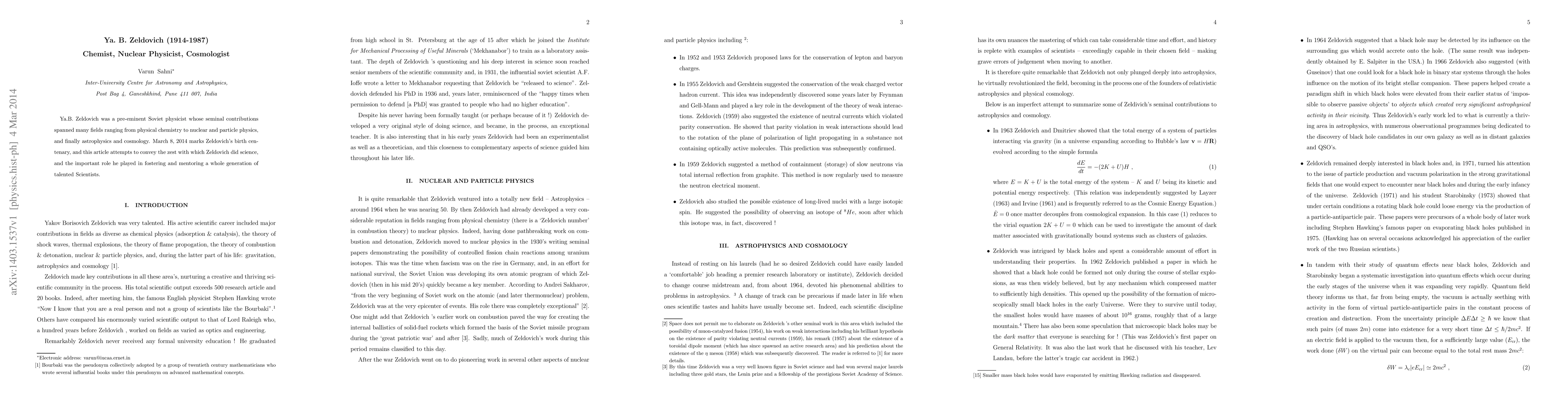 Ya.B. Zeldovich was a pre-eminent Soviet physicist whose seminal contributions spanned many fields ranging from physical chemistry to nuclear and particle physics, and finally astrophysics and cosmology. March 8, 2014 marks Zeldovich's birth centenary, and this article attempts to convey the zest with which Zeldovich did science, and the important role he played in fostering and mentoring a whole generation of talented Scientists.