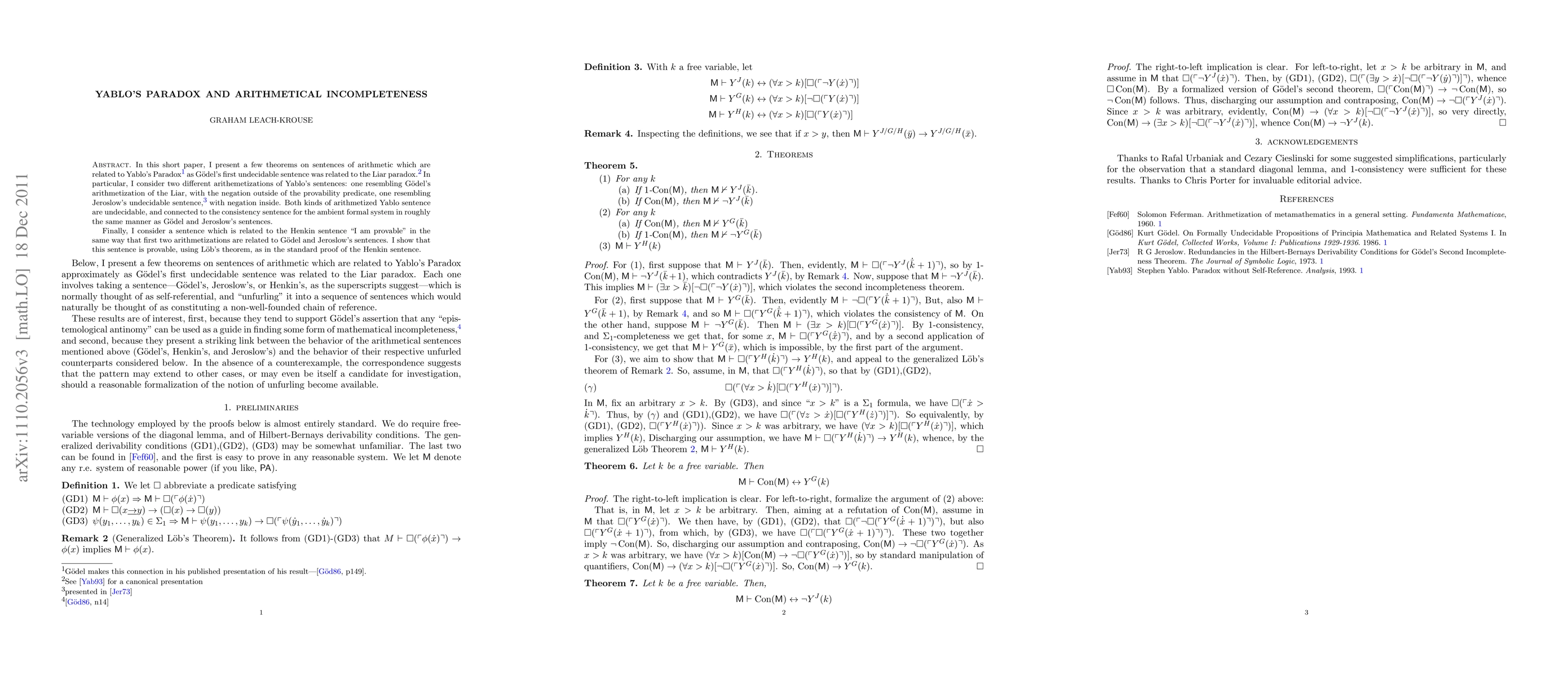 In this short paper, I present a few theorems on sentences of arithmetic which are related to Yablo's Paradox as G\"odel's first undecidable sentence was related to the Liar paradox. In particular, I consider two different arithemetizations of Yablo's sentences: one resembling G\"odel's arithmetization of the Liar, with the negation outside of the provability predicate, one resembling Jeroslow's undecidable sentence, with negation inside. Both kinds of arithmetized Yablo sentence are undecidable, and connected to the consistency sentence for the ambient formal system in roughly the same manner as G\"odel and Jeroslow's sentences. Finally, I consider a sentence which is related to the Henkin sentence "I am provable" in the same way that first two arithmetizations are related to G\"odel and Jeroslow's sentences. I show that this sentence is provable, using L\"ob's theorem, as in the standard proof of the Henkin sentence.