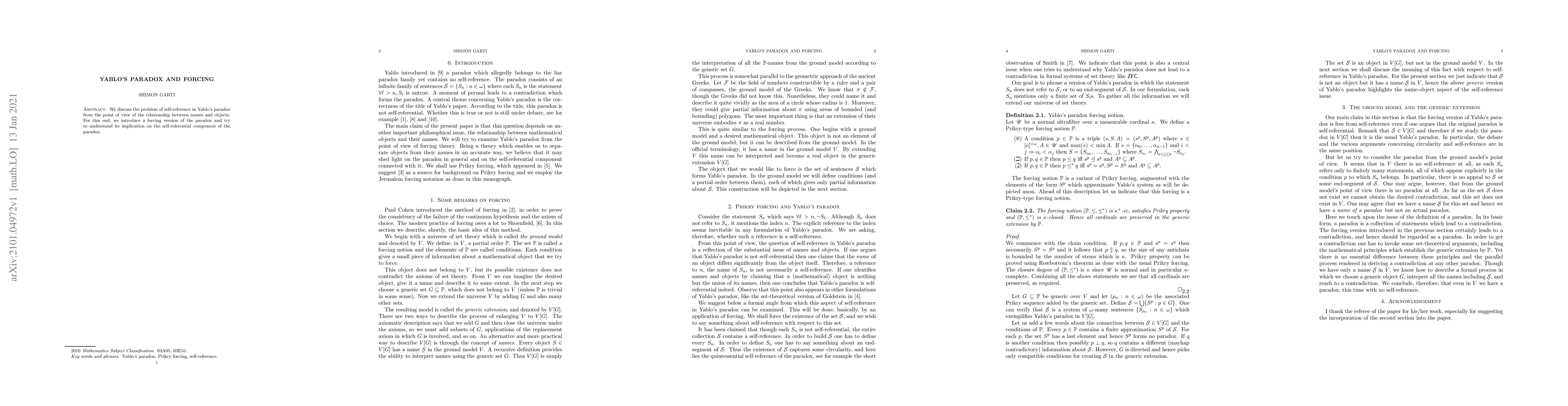 Summary: This paper proposes a forcing version of Yablo's paradox and explores its implications for self-referential statements, offering new insights into the nature of self-reference in mathematical logic.