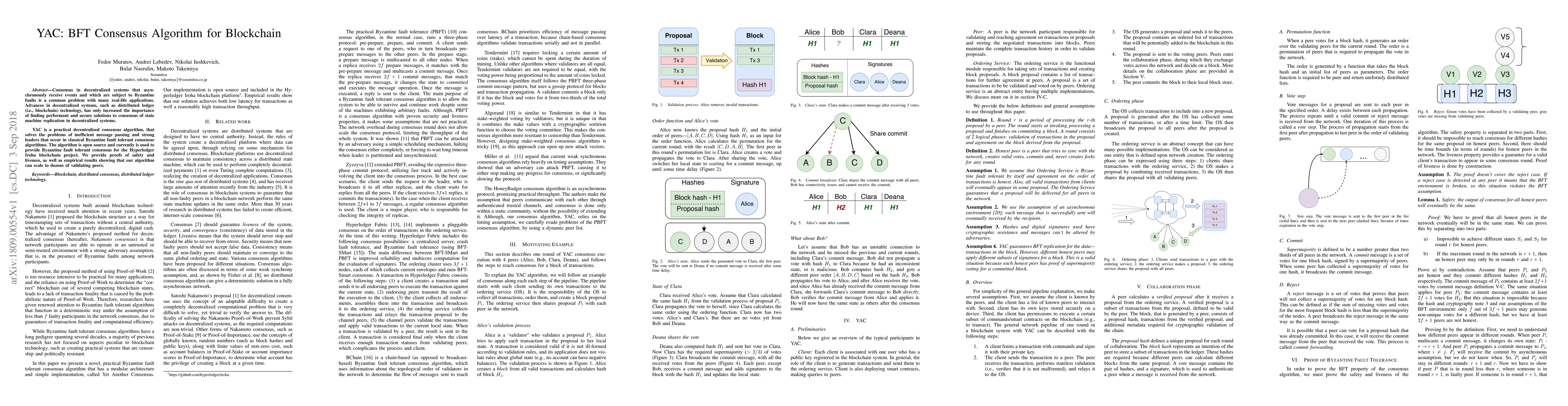 The paper introduces YAC, a practical Byzantine Fault Tolerance (BFT) consensus algorithm for blockchain systems. YAC improves upon classical BFT algorithms by addressing inefficient message passing and strong leadership issues, offering proofs of safety, liveness, and scalability demonstrated through empirical results with dozens of validating peers.