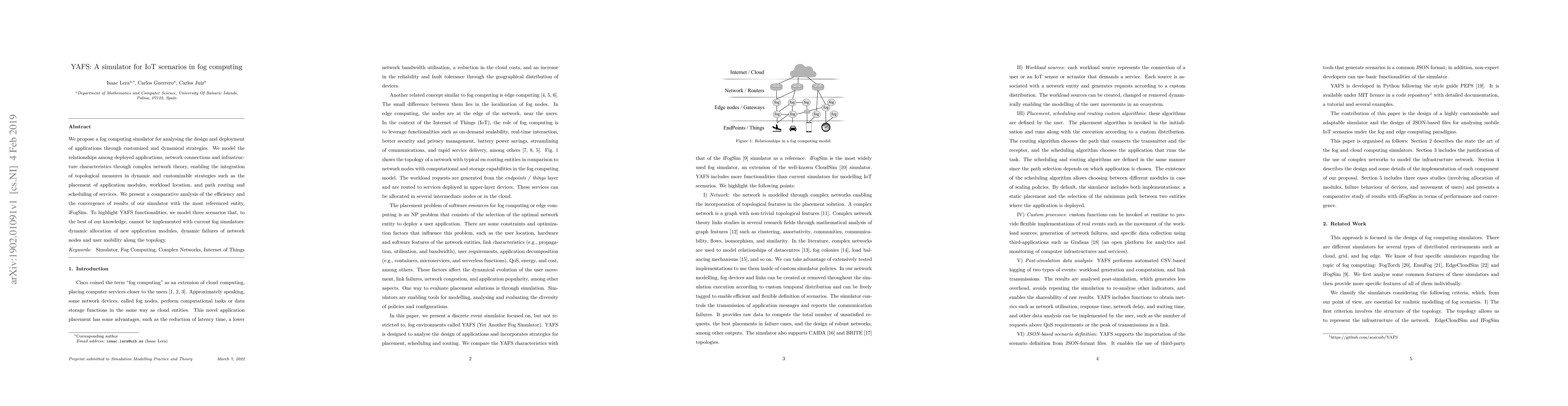 A new fog computing simulator called YAFS is proposed to analyze and design IoT scenarios, offering customizable strategies for application placement, workload location, and network routing. The simulator compares favorably to existing fog simulators like iFogSim and models complex scenarios such as dynamic allocation of new modules and user mobility.