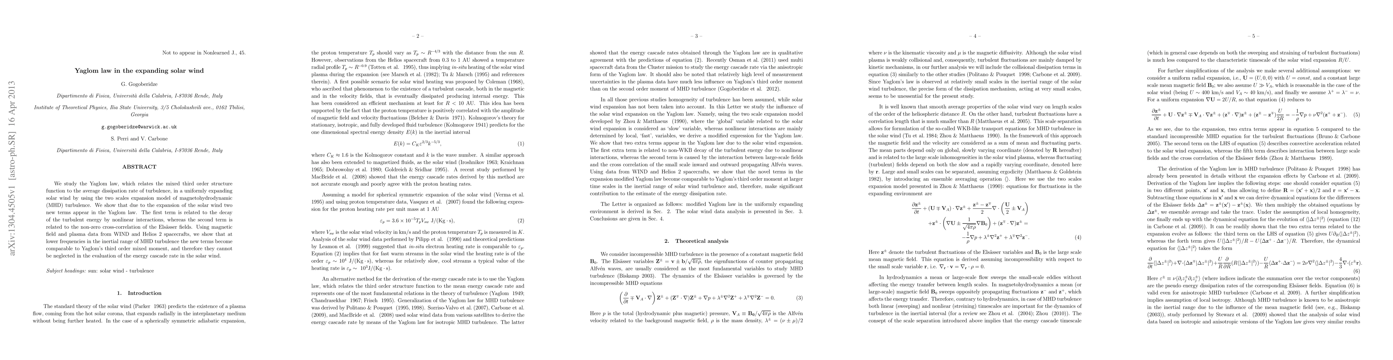 Researchers studied the Yaglom law in expanding solar wind, finding two new terms appear due to expansion that can't be neglected at lower frequencies, affecting energy cascade rate.