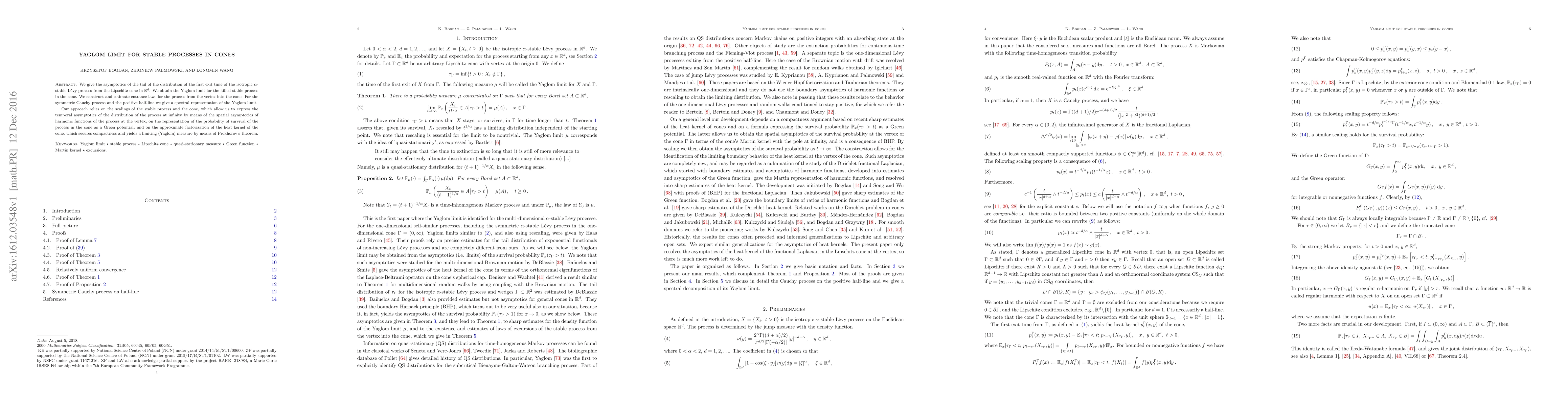 This paper derives the asymptotics of the first exit time distribution for an isotropic alpha-stable Lévy process from a Lipschitz cone in R^d, providing the Yaglom limit for the killed stable process within the cone. It constructs and estimates entrance laws for the process from the cone's vertex, offering a spectral representation for the symmetric Cauchy process and positive half-line. The methodology involves scalings of the stable process and cone, Green potential representation, and approximate factorization of the heat kernel.