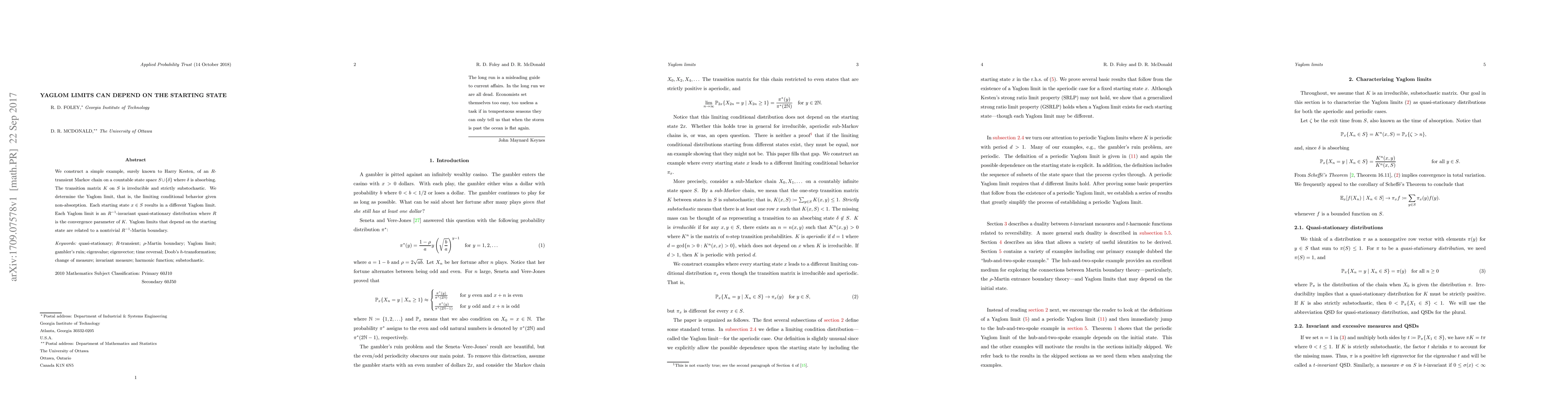 This paper constructs an R-transient Markov chain where the Yaglom limit, representing the conditional behavior given non-absorption, varies depending on the starting state. Each starting state yields a distinct Yaglom limit, which is an rho-invariant quasi-stationary distribution linked to a nontrivial rho-Martin entrance boundary.