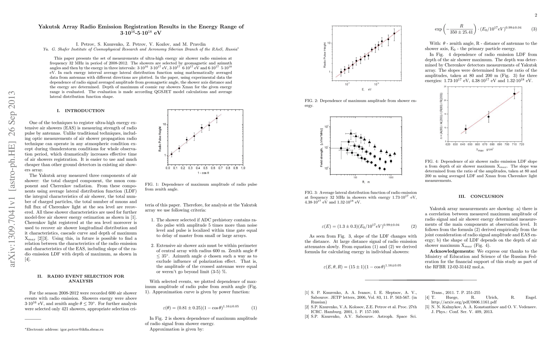 This paper presents the set of measurements of ultra-high energy air shower radio emission at frequency 32 MHz in period of 2008-2012. The showers are selected by geomagnetic and azimuth angles and then by the energy in three intervals: 3*10^16 3*10^17 eV, 3*10^17 6*10^17 eV and 6*10^17 5*10^18 eV. In each energy interval average lateral distribution function using mathematically averaged data from antennas with different directions are plotted. In the paper, using experimental data the dependence of radio signal averaged amplitude from geomagnetic angle, the shower axis distance and the energy are determined. Depth of maximum of cosmic ray showers Xmax for the given energy range is evaluated. The evaluation is made according QGSJET model calculations and average lateral distribution function shape.
