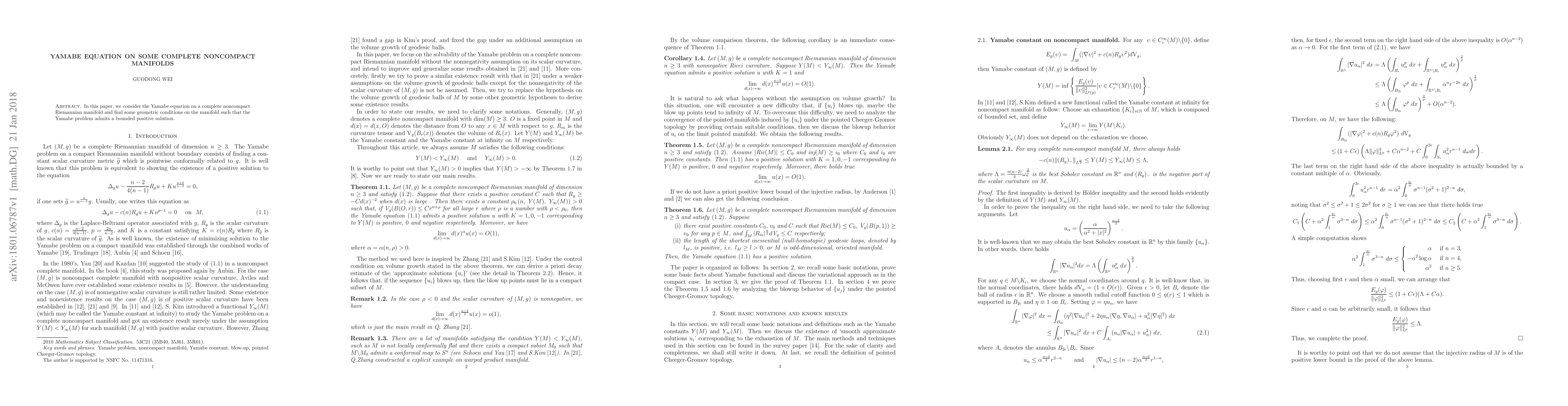 This paper investigates the Yamabe equation on complete noncompact Riemannian manifolds, identifying geometric conditions that ensure the existence of a bounded positive solution to the Yamabe problem.