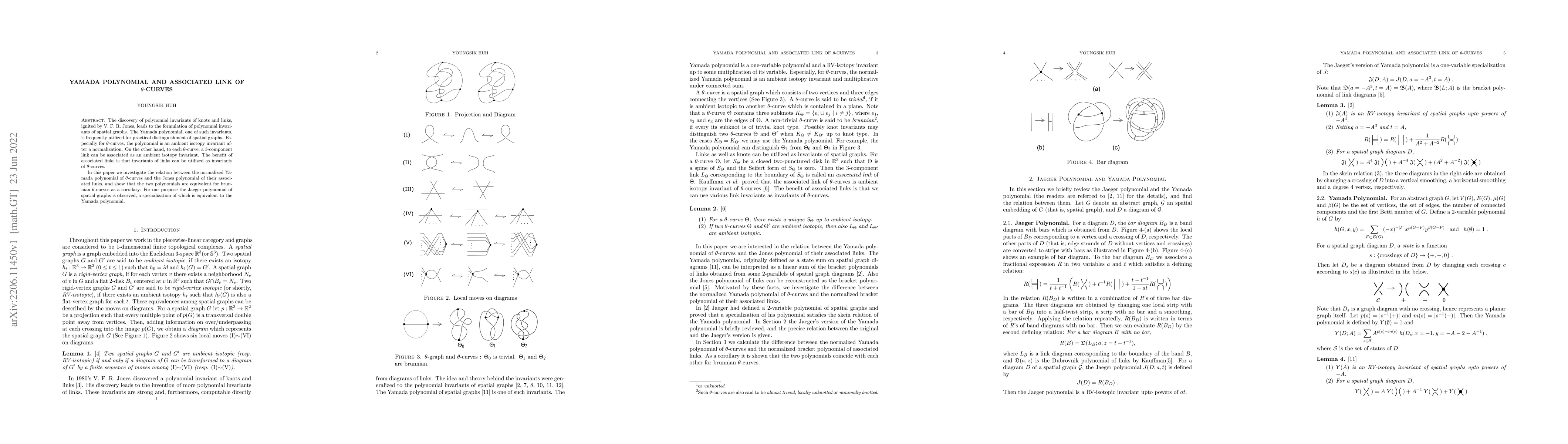 This paper explores the equivalence between the normalized Yamada polynomial of $\theta$-curves and the Jones polynomial of their associated 3-component links, demonstrating their equivalence for brunnian $\theta$-curves. It also examines the Jaeger polynomial, showing its specialization aligns with the Yamada polynomial.