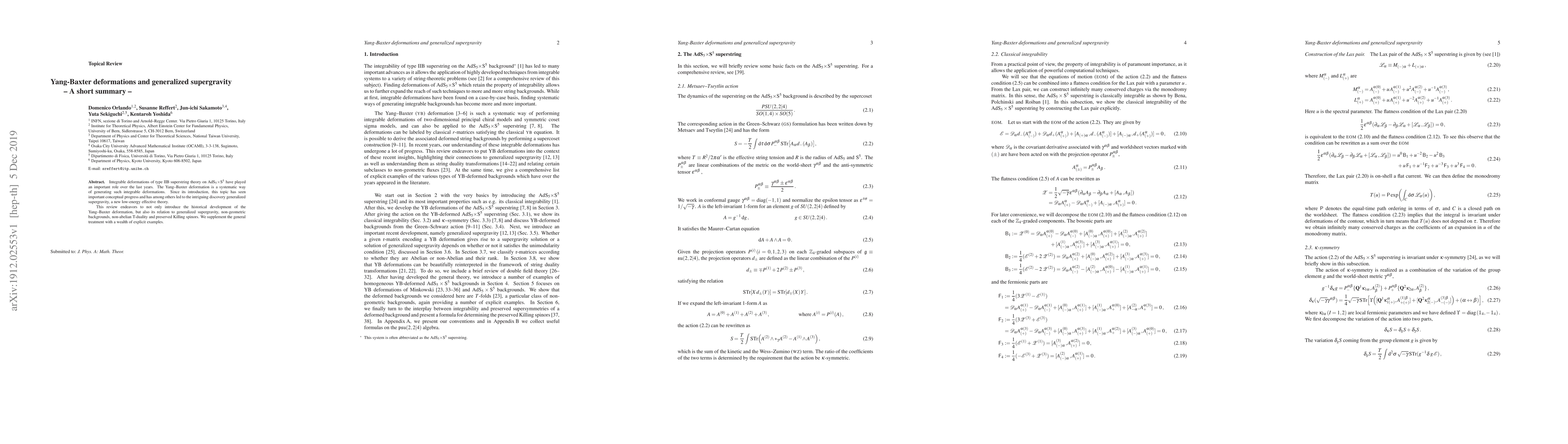 Integrable deformations of type IIB superstring theory on $\mathrm{AdS}_5\times S^5$ have played an important role over the last years. The Yang-Baxter deformation is a systematic way of generating such integrable deformations. Since its introduction, this topic has seen important conceptual progress and has among others led to the intriguing discovery generalized supergravity, a new low-energy effective theory. This review endeavors to not only introduce the historical development of the Yang-Baxter deformation, but also its relation to generalized supergravity, non-geometric backgrounds, non-abelian T-duality and preserved Killing spinors. We supplement the general treatment with a wealth of explicit examples.